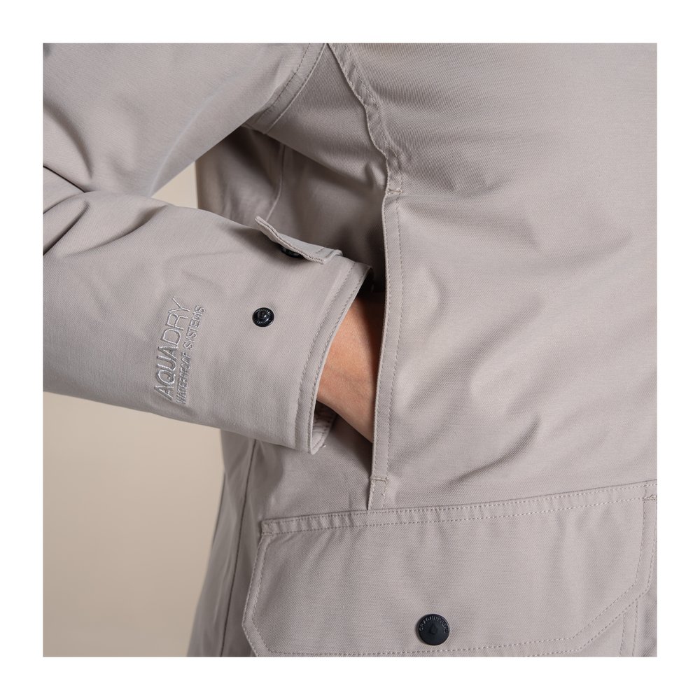 CRAGHOPPERS Rosalind II Jacket Women von Craghoppers ist eine funktionale Winterjacke, die zuverlässigen Schutz bei nasskaltem Wetter bietet. Mit ihrer AquaDry-Membran ist sie dauerhaft wasserdicht, atmungsaktiv und zusätzlich winddicht. Die integrierte ThermoAir+ Isolierung speichert Körperwärme und sorgt für angenehmen Tragekomfort bei kalten Temperaturen. Der längere Schnitt, eine fest vernähte Kapuze mit Kordelzug sowie durchdachte Details wie eine Sicherheitstasche mit Reißverschluss, vorgeformte Ärmel und sieben Taschen machen die Jacke zu einem idealen Begleiter für winterliche Outdoor-Aktivitäten.