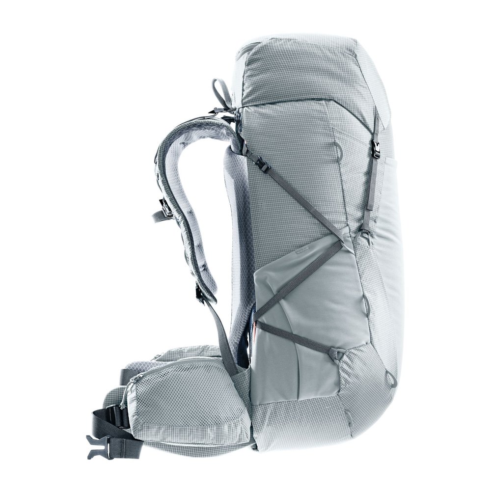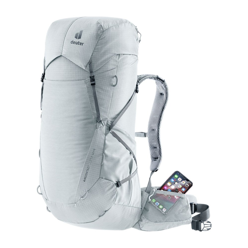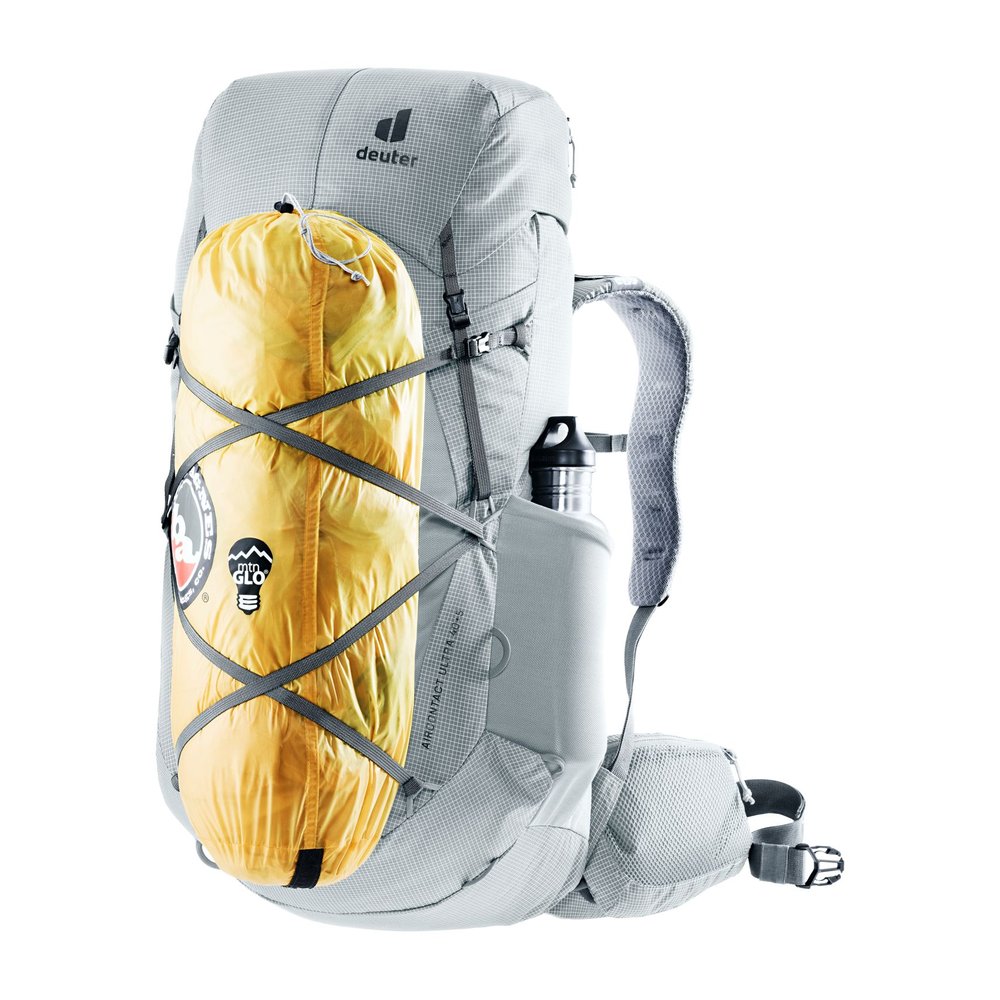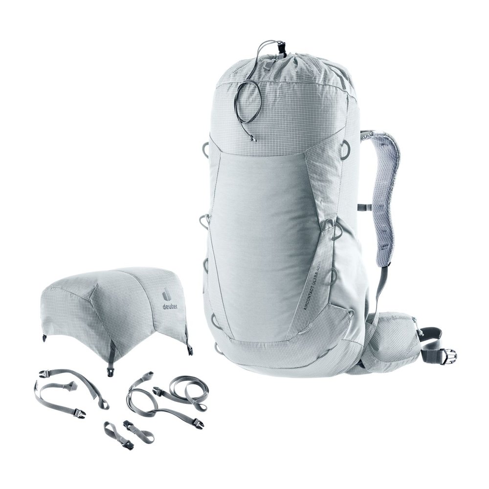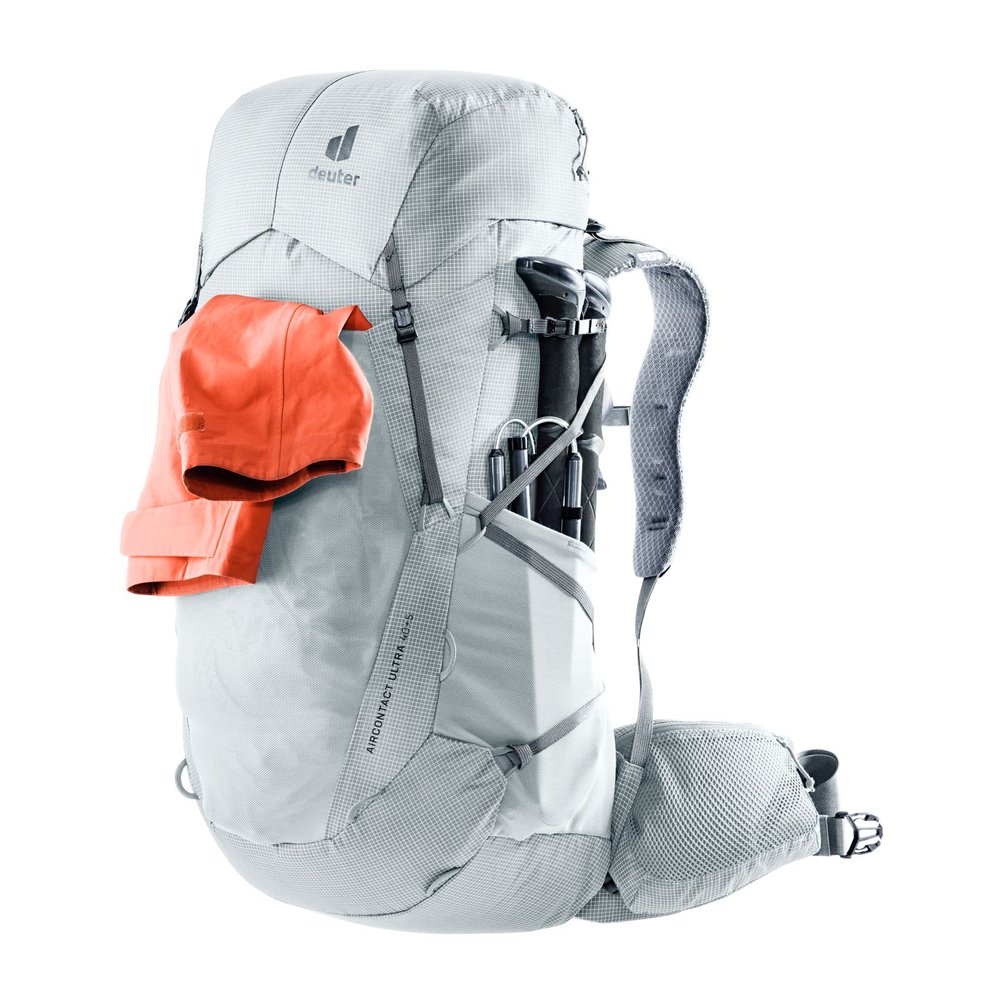 DEUTER Aircontact Ultra 40 + 5 ist ein ultraleichter Trekkingrucksack für anspruchsvolle Langstreckenwanderungen, bei denen jedes Gramm zählt. Mit einem Volumen von 40 + 5 Litern bietet er trotz seines geringen Gewichts von nur 1210 g genügend Stauraum für mehrtägige Touren. Das Aircontact-Rückensystem mit Air Spacer Mesh sorgt für ausgezeichnete Rückenbelüftung und gleichmäßige Lastenverteilung. Dank Clip & Loop-Rückenlängenanpassung, ergonomisch geformten Hüftflossen und Active Fit Schulterträgern lässt sich der Rucksack individuell anpassen und sitzt stabil am Körper. Der abnehmbare, höhenverstellbare Deckel ermöglicht eine Volumenerweiterung um 5 Liter und bietet flexible Packoptionen. Durch robuste Ripstop-Hochleistungsfasern ist der Aircontact Ultra zudem extrem widerstandsfähig – ideal für lange Trekkingtouren unter wechselnden Bedingungen.
