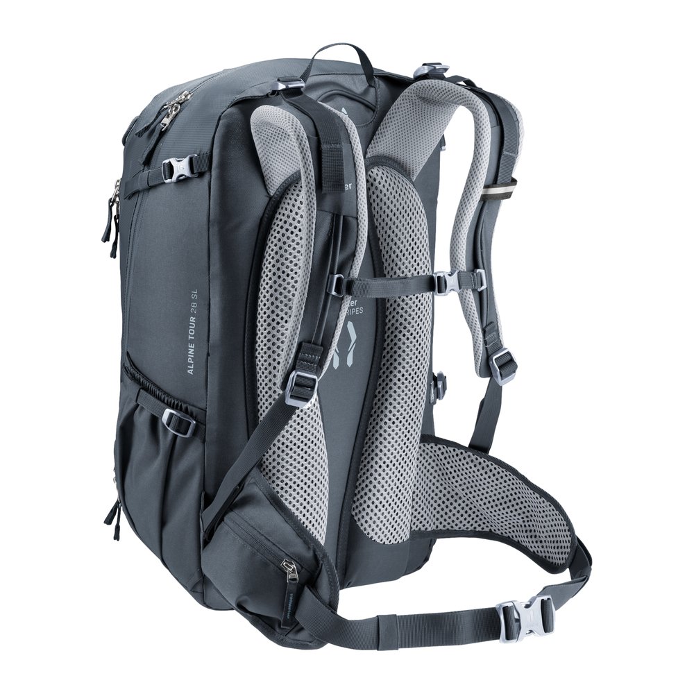 Der DEUTER Alpine Tour 28 SL ist der perfekte Tourenrucksack für Mehrtagestouren. Das Airstripes-Rückensystem sorgt für viel frische Luft am Rücken und angenehmen Tragekomfort, während die gepolsterten Schulterträger den Komfort weiter erhöhen. Das nah am Körper anliegende Tragesystem und der stufenlos verstellbare Brustgurt bieten einen kompakten Sitz beim Up- und Downhill. Die gut durchdachten Fächer und Taschen für Kleidung, Snacks und Werkzeug sorgen für eine einfache Handhabung und machen den Rucksack zum Allround-Talent für jede Tour.