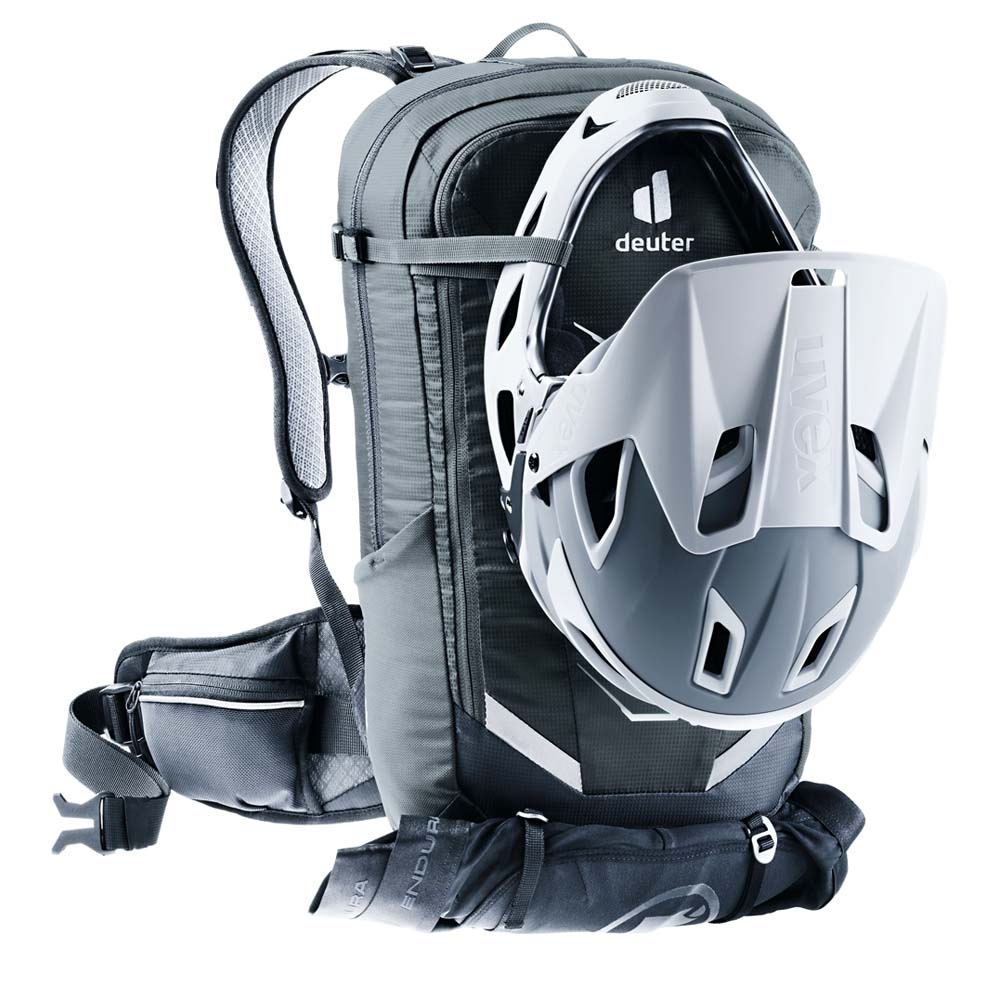 Weniger ist mehr – der gewichtsoptimierte, TÜV/GS zertifizierte Protektor-Rucksack Flyt 14 von Deuter ist auf die essenziellen Features reduziert. So sorgt ein leichter, herausnehmbarer Rückenprotektor für Schutz bei Stürzen. Zur Fixierung des Helms gibt es Clips außen am Rucksack (Halbschalen-Helm) oder seitliche Kompressionsriemen (Fullface-Helm). Zwei verstaubare Riemen am unteren Ende des Rucksacks ermöglichen zudem die Befestigung der Bike-Protektoren. Das bewährte, leichte Airstripes-System sorgt zusätzlich für ausreichende, angenehme Belüftung am Rücken.