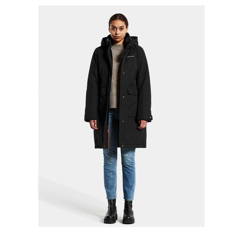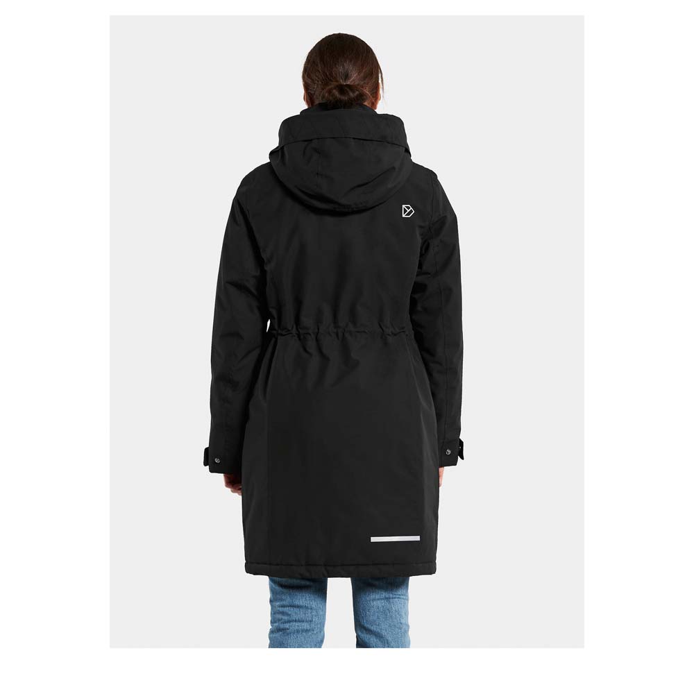 Der Fellimitatbesatz, die Didriksons-Logos sowie die Reißverschlusslaschen sind reflektierend. Bei Bedarf kann ein reflektierendes Band in der Fronttasche nach außen gedreht werden.