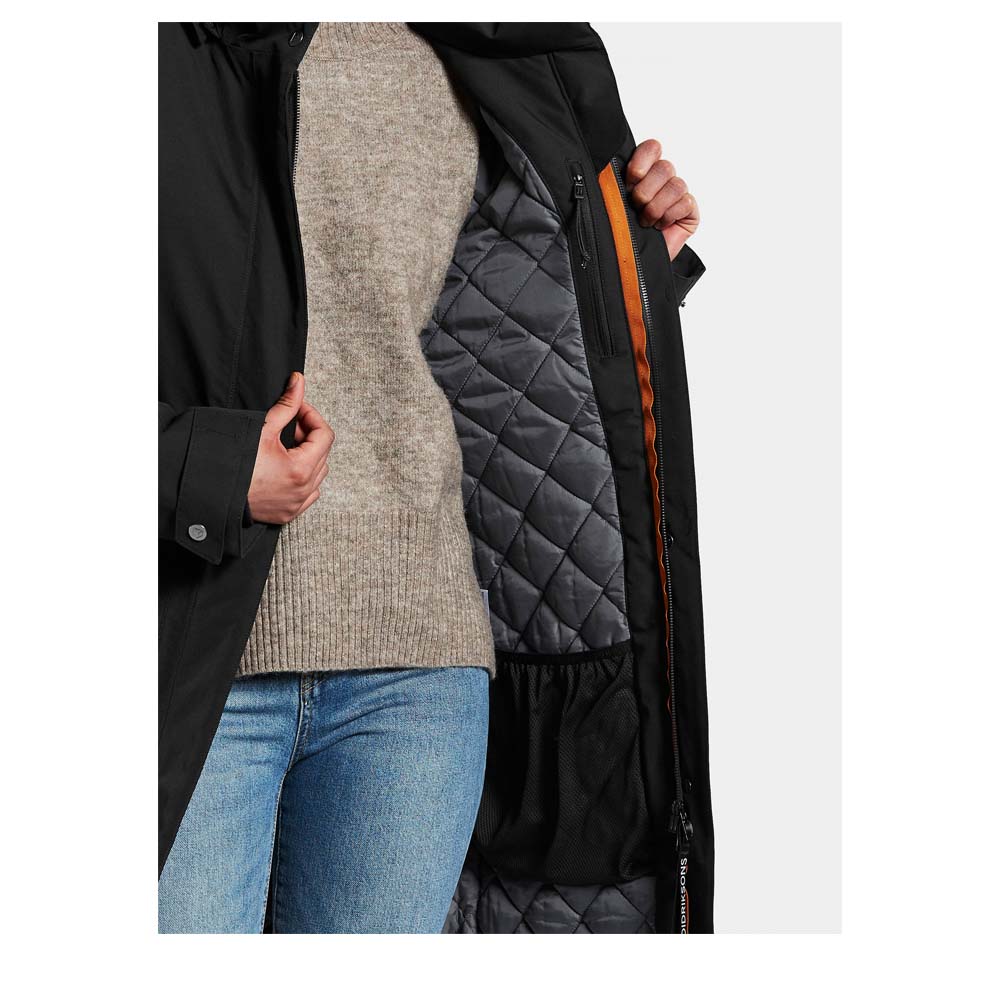 Geldbeutel, Handy, Taschentücher und Schlüssel finden in einer der zahlreichen Taschen des Emilia Parkas Platz: Zwei geknöpfte Fronttaschen, zwei Taschen mit wasserdichtem Reißverschluss und zwei Innentaschen, eine davon mit Reißverschluss, stehen zur Verfügung! Saum, Taille, Ärmelabschlüsse und Kapuze sind bei Bedarf verstellbar. Die gerippte Innenbündchen haben ein Daumenloch.