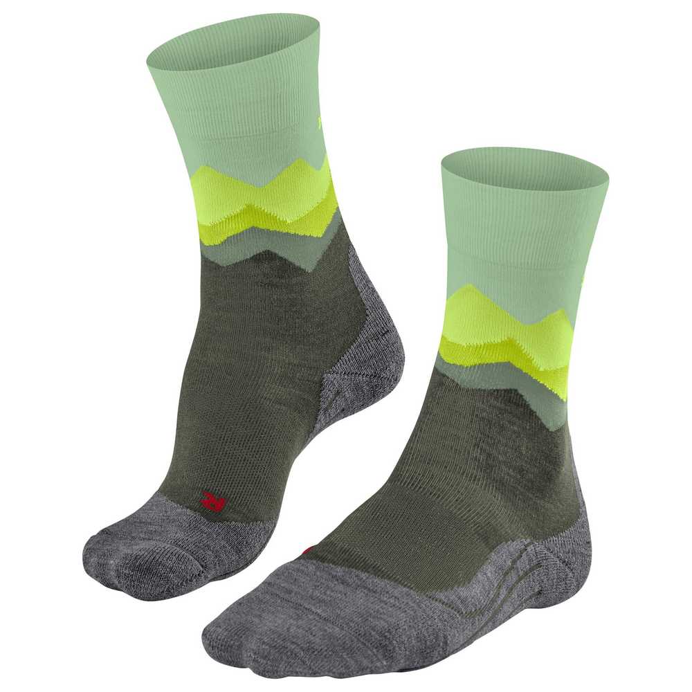 FALKE TK2 Explore Damen Trekking Socken. Die "TK2 Crest" bietet mit ihrer mittelstarken Polsterung und dem Merinowoll-Mix besten Komfort sowie eine gute Wärmeisolation bei Wanderungen in leichtem Gelände und unter allen Wetterbedingungen. Dank schnellem Feuchtigkeitstransport und optimaler Passform wird eine perfekte Temperatur im Schuh und ein hoher Fußkomfort gewährleistet. Die im Schaft integrierte Bergsilhouette in verschiedenen Farbschattierungen macht diese Wandersocke zu einem echten Blickfang.