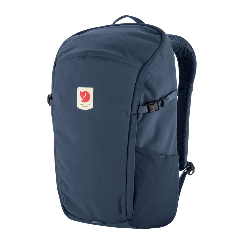 FJÄLLRÄVEN Ulvö 23 ist ein vielseitiger Tagesrucksack aus wasserdichtem, langlebigem Bergshell-Material, das zu 100 % aus recyceltem Polyamid besteht. Er verfügt über ein großes Hauptfach mit Reißverschluss und ein gepolstertes Laptopfach für Geräte bis 15 Zoll. Zusätzlichen Stauraum bieten eine große Fronttasche mit Reißverschluss und Schlaufe für eine Fahrradlampe sowie seitliche Stretch-Taschen. Der Rucksack ist ideal für leichte Wanderungen, den Alltag oder Reisen und verfügt über einen abnehmbaren Brustgurt für besseren Halt.