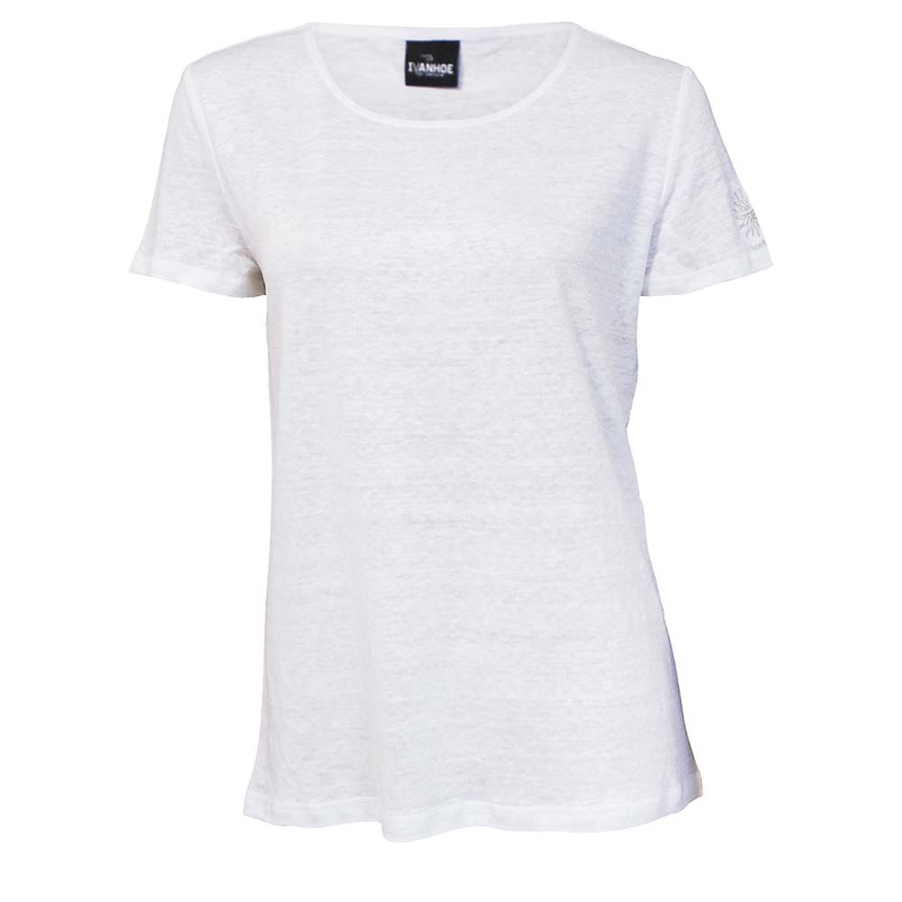 Das Ivanhoe GY Leila T-Shirt für Damen ist ein schlichtes und komfortables Basic-Shirt, ideal für warme Tage. Gefertigt aus 100% Leinen, bietet es ein kühles und angenehmes Tragegefühl. Das Shirt verfügt über einen klassischen Rundhalsausschnitt und ein dezentes Logo-Badge am linken Oberarm. Das Material ist nach dem STANDARD 100 by OEKO-TEX® zertifiziert.