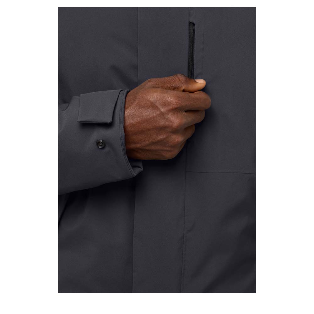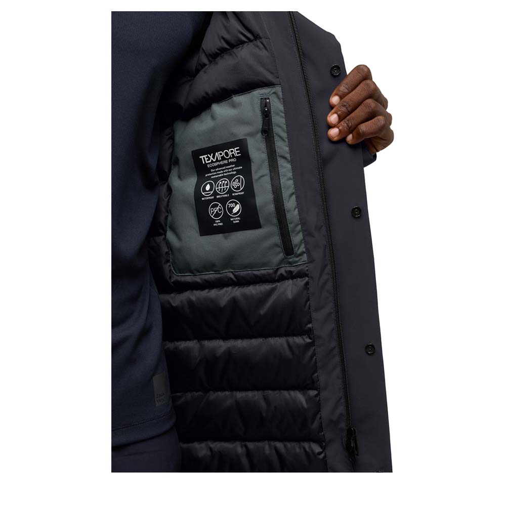 Der Jack Wolfskin Brandenburger Herren Daunenparka vereint Funktionalität und Fashion. Das innovative Texapore Ecosphere Pro Material und die 700er RDS-zertifizierte Daune machen diesen Parka zum perfekten Begleiter für Outdoor-Aktivitäten und den urbanen Alltag. Zu den Details gehören eine diskrete Brusttasche und 2 Hüfttaschen sowie ein Formsaum und eine fest mit der Jacke verbundene, verstellbare Kapuze.