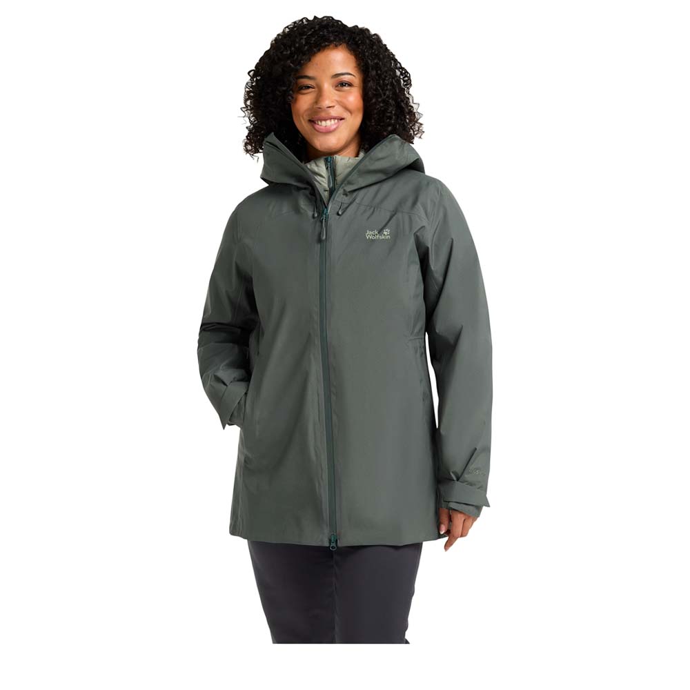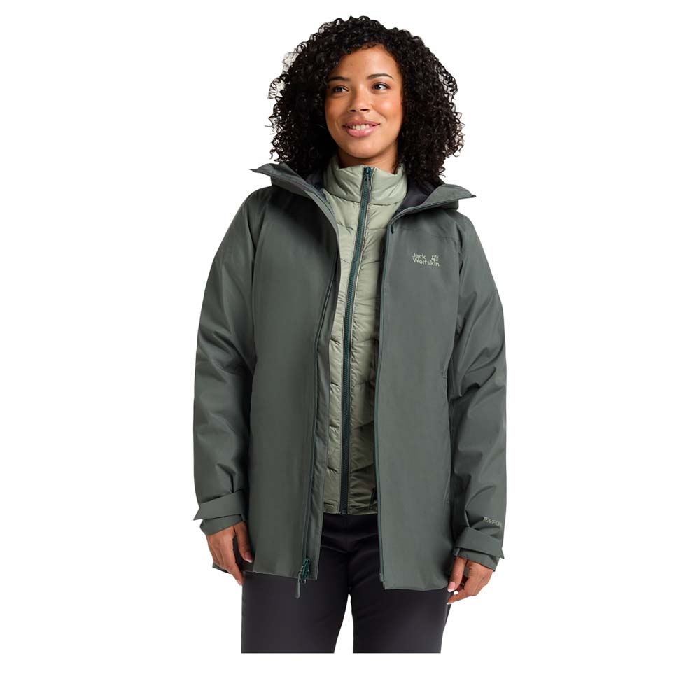 Diese 3-in-1-Jacke kombiniert eine wetterfeste Außenjacke mit einer warmen Daunen-Innenjacke. Die Außenjacke besteht aus TEXAPORE ECOSPHERE PRO, einem recycelten Material, das nicht nur wasserdicht und atmungsaktiv ist, sondern auch nachhaltig. Zusätzlich schützen die wasserdichten Reißverschlüsse vor Feuchtigkeit. Dank des längeren, femininen Schnitts und des mittigen 2-Wege-Reißverschlusses kann die Passform individuell angepasst werden, was für mehr Bewegungsfreiheit und Komfort sorgt.
