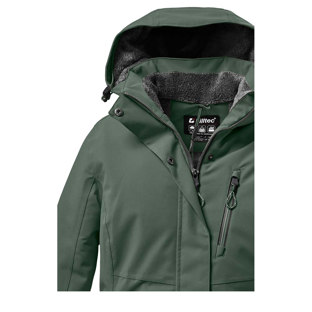 Für zusätzlichen Komfort und Wärme sind die Kapuze und der Kragen mit kuscheligem Teddyfleece gefüttert. Die Kapuze kann bei Bedarf abgenommen und individuell verstellt werden, ebenso wie die Ärmelbündchen, die sich durch Klettverschlüsse anpassen lassen.