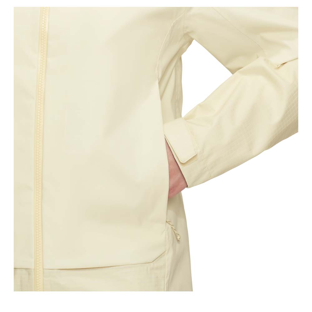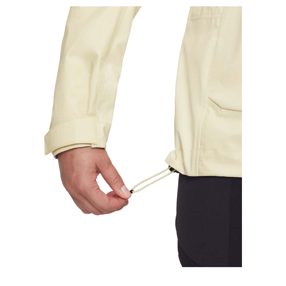 Die Jacke besteht vollständig aus recycelten Materialien, was sie zu einer nachhaltigen Wahl macht. Die einhändig verstellbare Kapuze und der verstellbare Saum mit leicht zugänglichen Kordelzügen ermöglichen eine individuelle Anpassung.