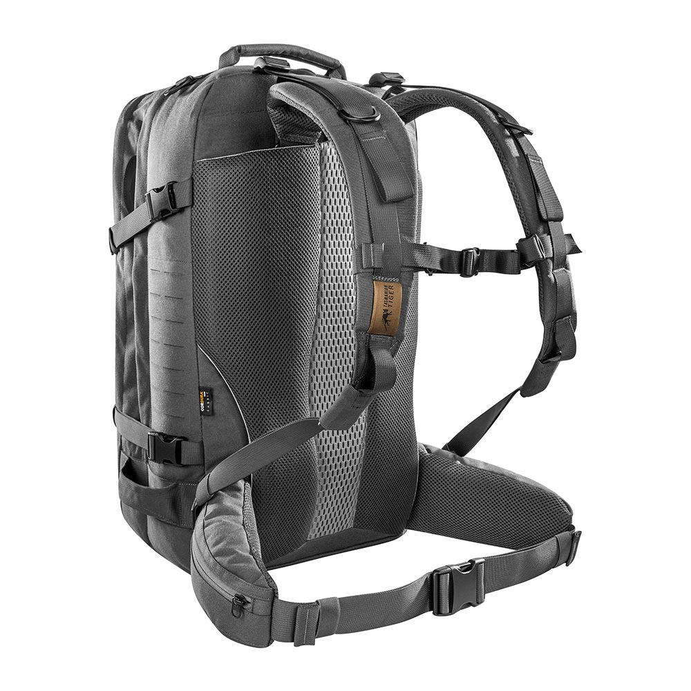 Der Mission Pack MKII von Tasmanian Tiger ist ein Tourenrucksack mit Laser Cut Ausführung, in dem sich einiges verstauen lässt. Er verfügt über ein Padded Back-Tragesystem, einen Hüftgurt mit Reißverschlusstaschen und drei Schlauch- bzw. Antennendurchlässe in den Hauptfächern, so dass auch eine Trinkblase untergebracht werden kann. Eine von außen zugängliche, seitliche Reißverschlusstasche ist für Dokumente vorgesehen und der stabile, verstärkte Handgriff ermöglicht es den Rucksack auch vollgepackt von oben anzuheben. Zwei große Hauptfächer und eine integrierte Regenhülle im Bodenfach sorgen für die benötigte Ausstattungsgrundlage. Die mit Reißverschlusstaschen versehenen Hüftflügel sind abnehmbar. Darüber hinaus findet eine 7-fache Unterteilung durch separate Taschen statt. Die Rückenplatte mit Aluschiene ist herausnehmbar und individuell formbar. Bei einem Verwundeten lässt sich ein Bergegriff anwenden, um diesen zu transportieren.