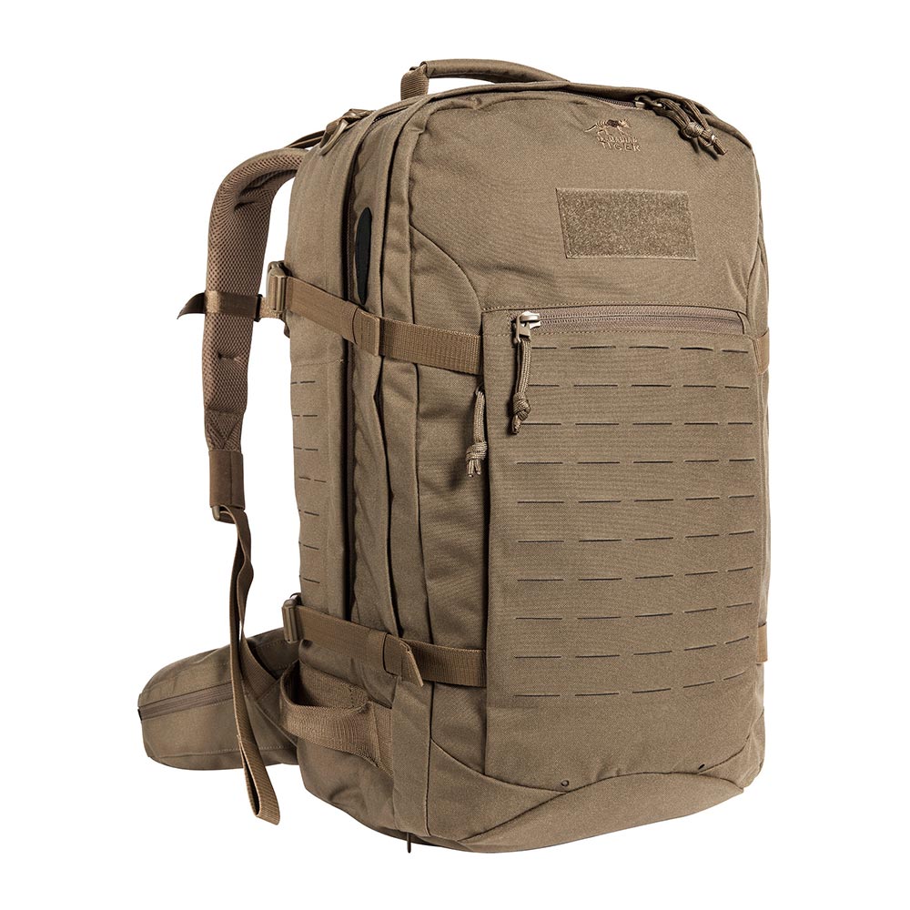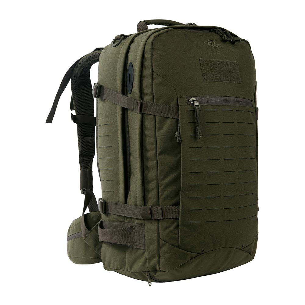 Der Mission Pack MKII von Tasmanian Tiger ist ein Tourenrucksack mit Laser Cut Ausführung, in dem sich einiges verstauen lässt. Er verfügt über ein Padded Back-Tragesystem, einen Hüftgurt mit Reißverschlusstaschen und drei Schlauch- bzw. Antennendurchlässe in den Hauptfächern, so dass auch eine Trinkblase untergebracht werden kann. Eine von außen zugängliche, seitliche Reißverschlusstasche ist für Dokumente vorgesehen und der stabile, verstärkte Handgriff ermöglicht es den Rucksack auch vollgepackt von oben anzuheben. Zwei große Hauptfächer und eine integrierte Regenhülle im Bodenfach sorgen für die benötigte Ausstattungsgrundlage. Die mit Reißverschlusstaschen versehenen Hüftflügel sind abnehmbar. Darüber hinaus findet eine 7-fache Unterteilung durch separate Taschen statt. Die Rückenplatte mit Aluschiene ist herausnehmbar und individuell formbar. Bei einem Verwundeten lässt sich ein Bergegriff anwenden, um diesen zu transportieren.
