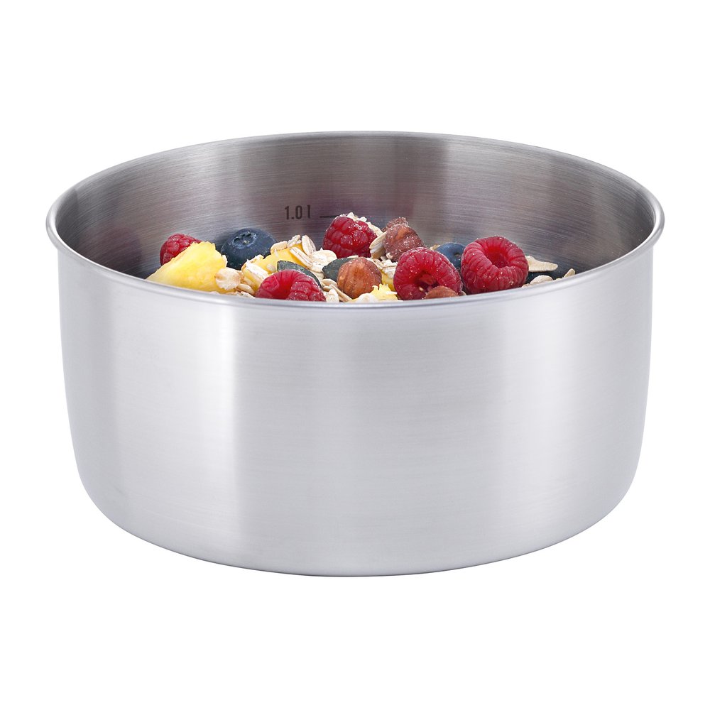Technische Details: Maße: Ø 16,5 x 7,5 cm, Volumen: 1,4 l, Gewicht: 160 g, Material: Edelstahl.