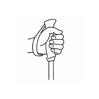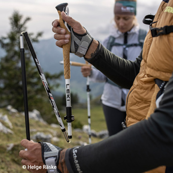 Greife von unten in die Schlaufen, damit dein Handgelenk entlastet wird. So überträgst du die Kraft gleichmäßiger auf den Stock und kannst entspannter gehen.