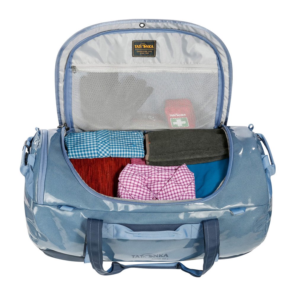 Die Tatonka Barrel 65 Reisetasche bietet ein Volumen von 65 Litern, ideal für das Gepäck einer einwöchigen Reise. Sie ist mit abnehmbaren Rucksackgurten für leichten Transport ausgestattet. Breite Tragegriffe und Griffe an allen Seiten erleichtern das Handling über kurze Strecken oder beim Verstauen im Auto. Das robuste, TPU-beschichtete Nylonmaterial der Tasche und der abriebfeste, PFAS-freie Boden garantieren Langlebigkeit. Die große Öffnung ermöglicht ein schnelles Packen, während kleinere Items in der Netztasche unter dem Deckel oder in den Einsteckfächern Platz finden. Eine zusätzliche Reißverschlusstasche an der Seite bietet externen Zugang. Der gepolsterte Boden schützt den Inhalt, und externe Kompressionsriemen reduzieren das Volumen nach Bedarf.