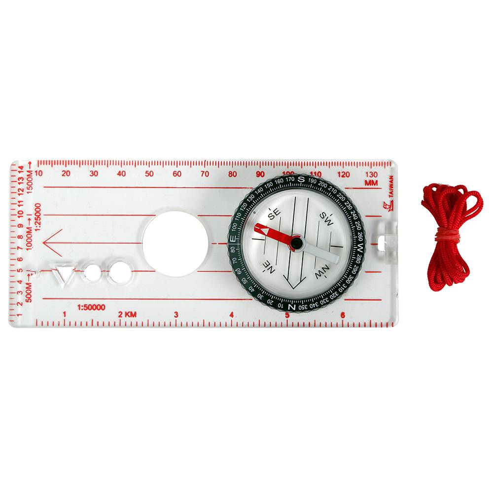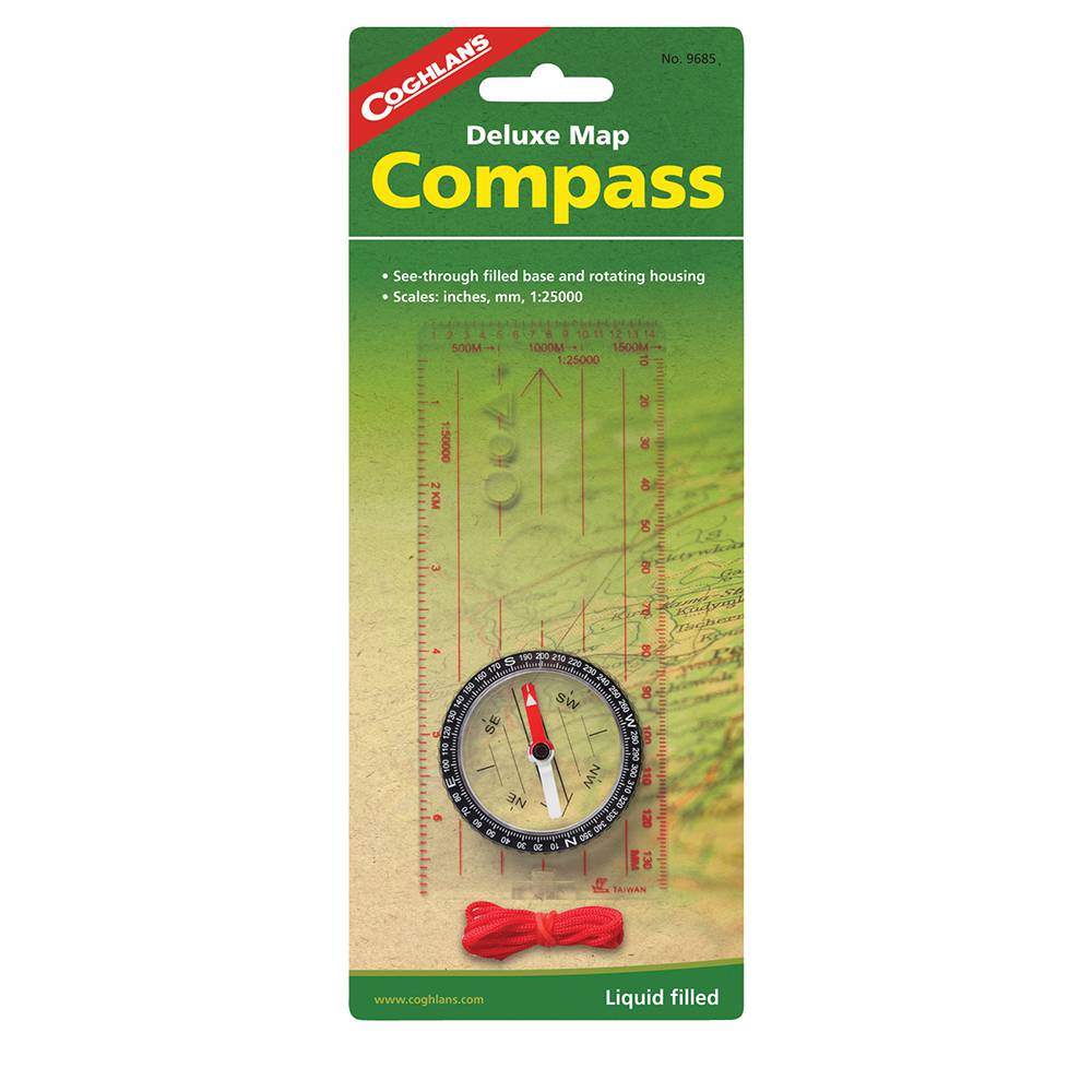Der Coghlans Kartenkompass ist ein kleiner, handlicher Kompass für die Arbeit mit der Karte. Er besteht aus einer durchsichtigen Bodenplatte und ein drehbares Gehäuse. Die Skalen sind in mm und Inches angegeben. Der Kompass ist Flüssigkeitsgedämpft, mit juwelengelagerter Nadel und mit Kordel.