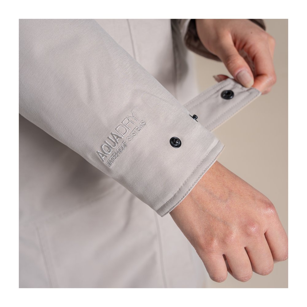 - Pflegehinweise: Waschbar bei 30 °C, Schonschleudern, Maschinenwäsche mit AquaDry-Reinigungsmittel oder reiner Seife, keine Bleichmittel oder Weichspüler, gut ausspülen, nicht auswringen, trocknergeeignet bei niedriger Temperatur, bei geringer Hitze auf der Außenseite bügeln, nicht chemisch reinigen, Verschlüsse vor dem Waschen schließen, AquaDry-Imprägniermittel bei Bedarf auftragen