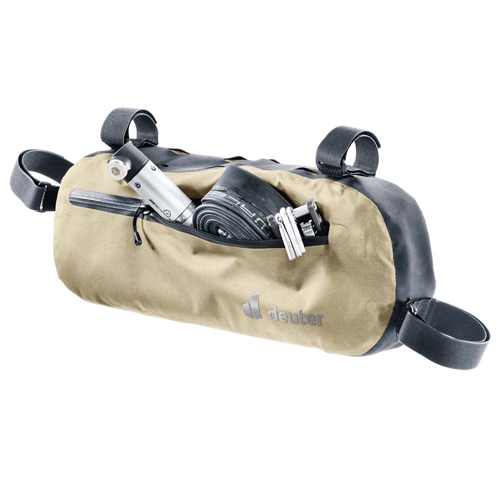 Leichte wasserdichte Rahmentasche Cabezon FB 4 von Deuter für echte Globetrotter aus strapazierfähigem Material mit reflektierenden Elementen, Materialschlaufen und großem Reißverschlusszugang zum geräumigen Hauptfach. Die vier Doppelklettverschlüsse zur sicheren Fixierung können an unterschiedlichste Rahmengrößen und Rohrdurchmesser angepasst werden und sind auch für Carbon-Fahrräder geeignet.