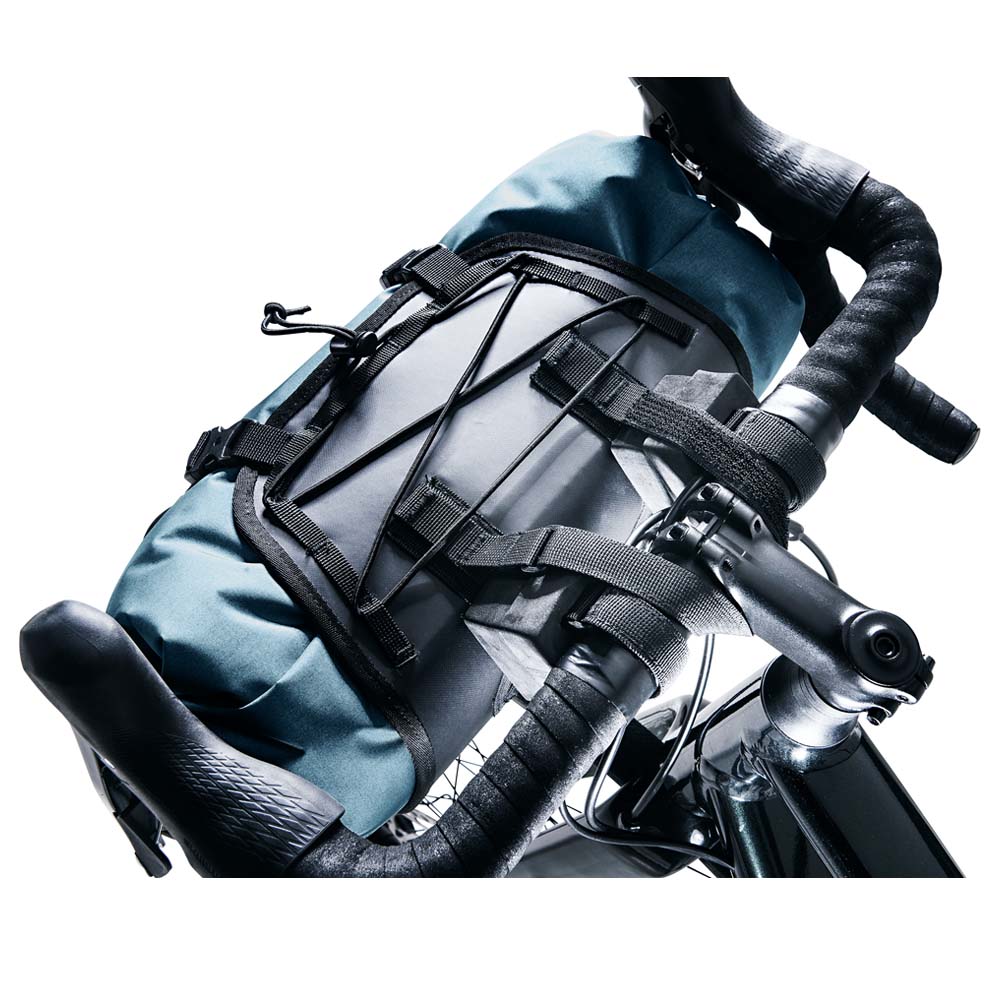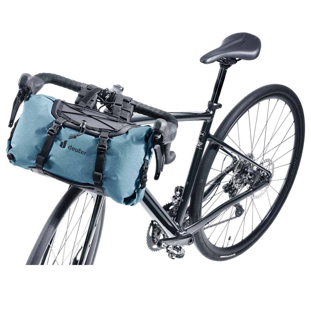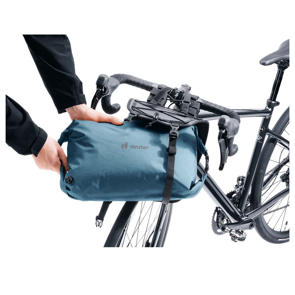 Leichte zweiteilige Handlebar Bag Cabezon HB 14 von Deuter für echte Globetrotter aus leichtem, wasserdichtem Packsack mit beidseitigem Roll-Top und Komprimierungsventil sowie Lenkertasche aus strapazierfähigem Material mit elastischem Kompressionszug und Materialschlaufen auf der Oberseite, ermöglicht schnelles Be- und Entladen bei spontanen Zwischenstopps, da die Taschenhalterungen am Fahrrad belassen, während der Packsack mitgenommen werden kann. Die robusten Gurtbänder können dank Klettverschluss zur Verdrehsicherung und mitgelieferter Distanzstücke an unterschiedlichste Rohrdurchmesser angepasst werden und sind auch für Carbon-Fahrräder geeignet.