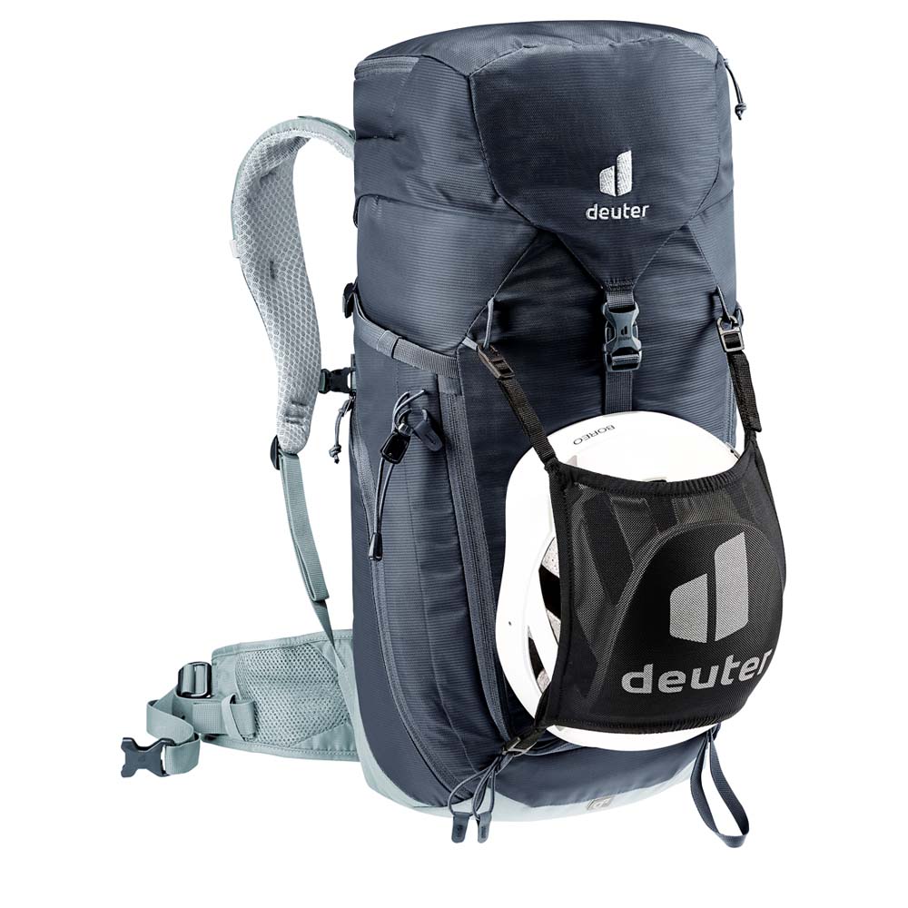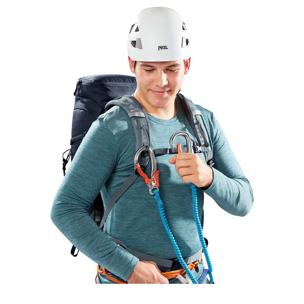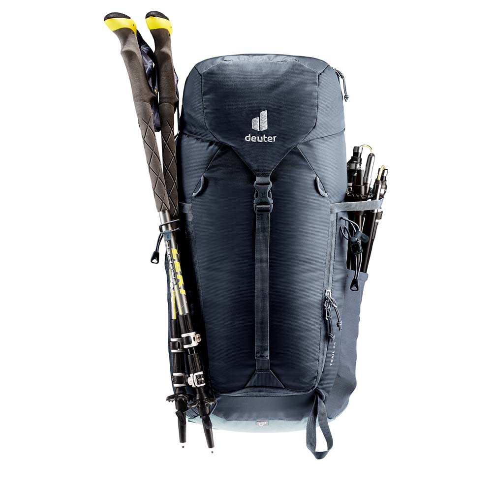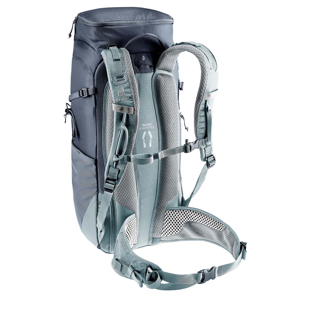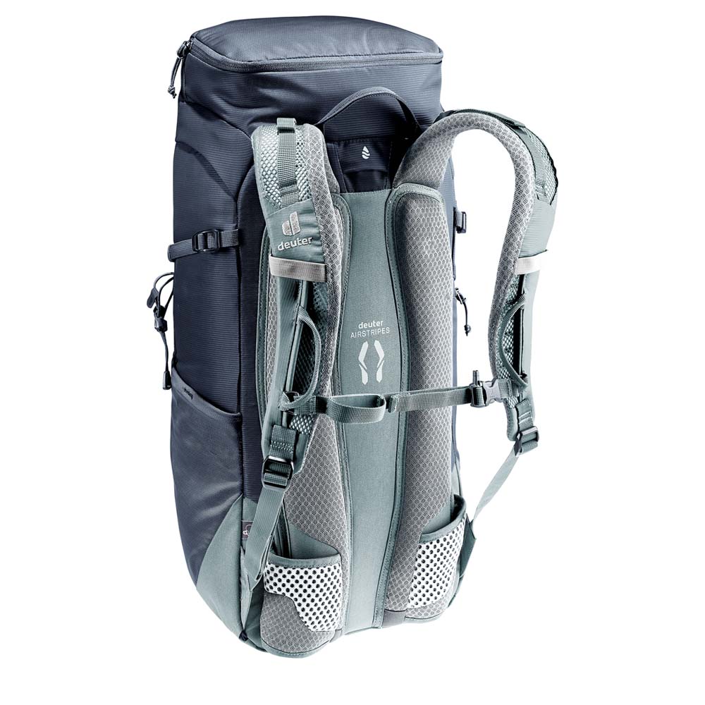 Der Trail 24 von Deuter ist ein Wanderrucksack. Das Airstripes Rückensystem mit geringer Rückenauflage und großen Belüftungskanälen sowie die perforierten Schulterträger und Hüftflossen sorgen für optimale Luftzirkulation, körpernahe Gewichtsverteilung und damit einen kompakten Sitz in jedem Terrain. Dank Fixierungen an den Schulterträgern sind die Karabiner des Klettersteigsets stets griffbereit. Zudem sind Ausrüstungsgegenstände und Material dank großer Rundbogenöffnung mit Reißverschluss, elastischer Frontstecktasche und Seitentaschen schnell zur Hand.