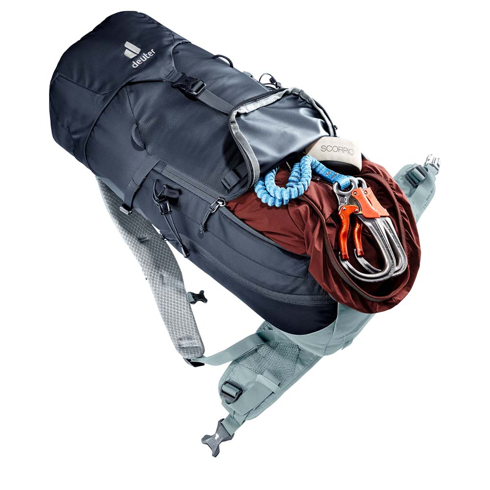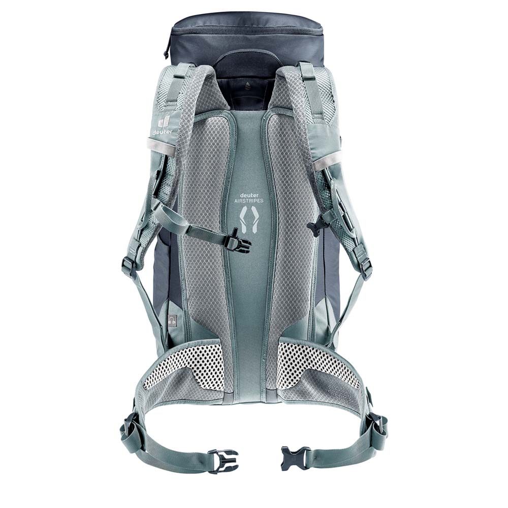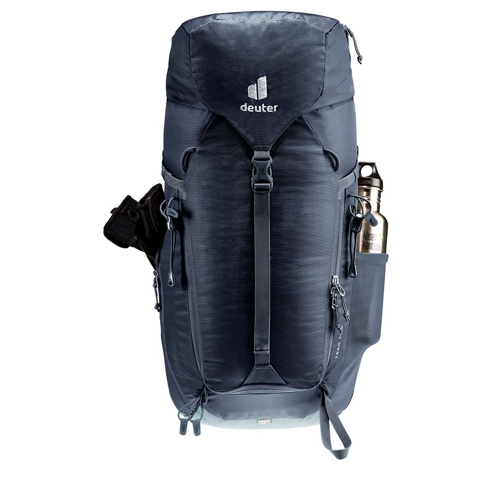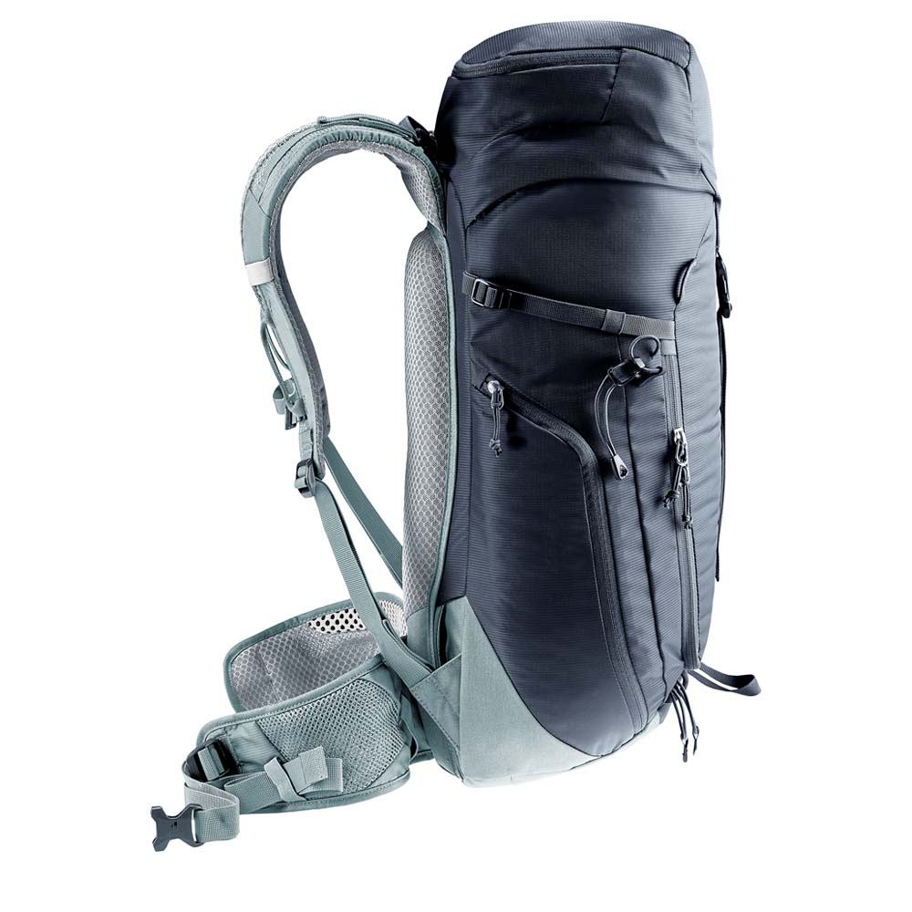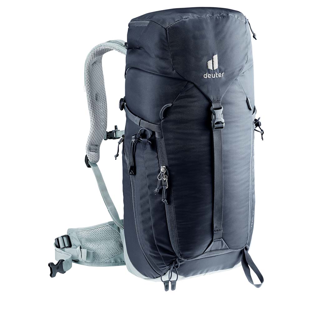 Der Trail 24 von Deuter ist ein Wanderrucksack. Das Airstripes Rückensystem mit geringer Rückenauflage und großen Belüftungskanälen sowie die perforierten Schulterträger und Hüftflossen sorgen für optimale Luftzirkulation, körpernahe Gewichtsverteilung und damit einen kompakten Sitz in jedem Terrain. Dank Fixierungen an den Schulterträgern sind die Karabiner des Klettersteigsets stets griffbereit. Zudem sind Ausrüstungsgegenstände und Material dank großer Rundbogenöffnung mit Reißverschluss, elastischer Frontstecktasche und Seitentaschen schnell zur Hand.