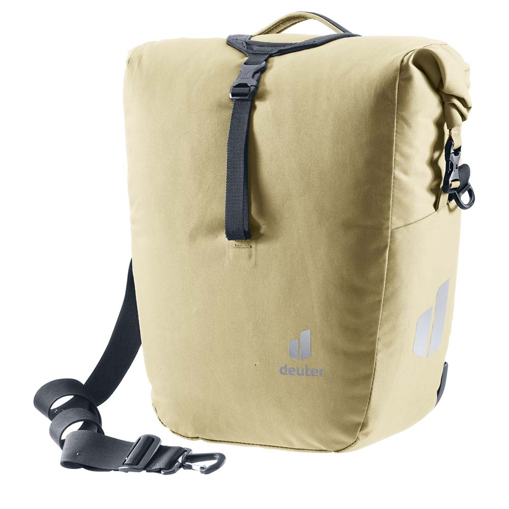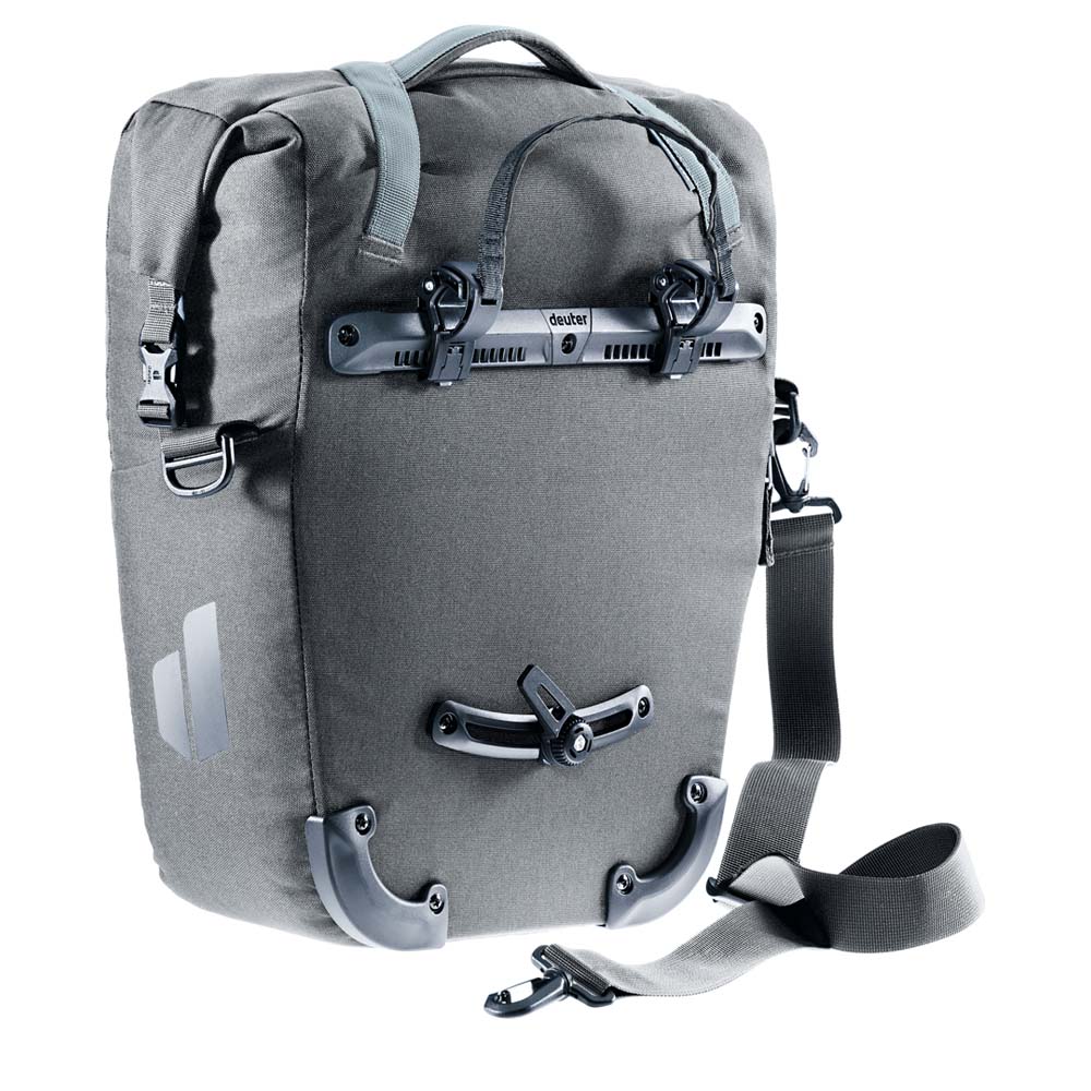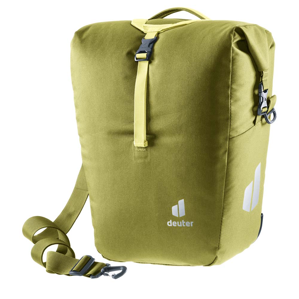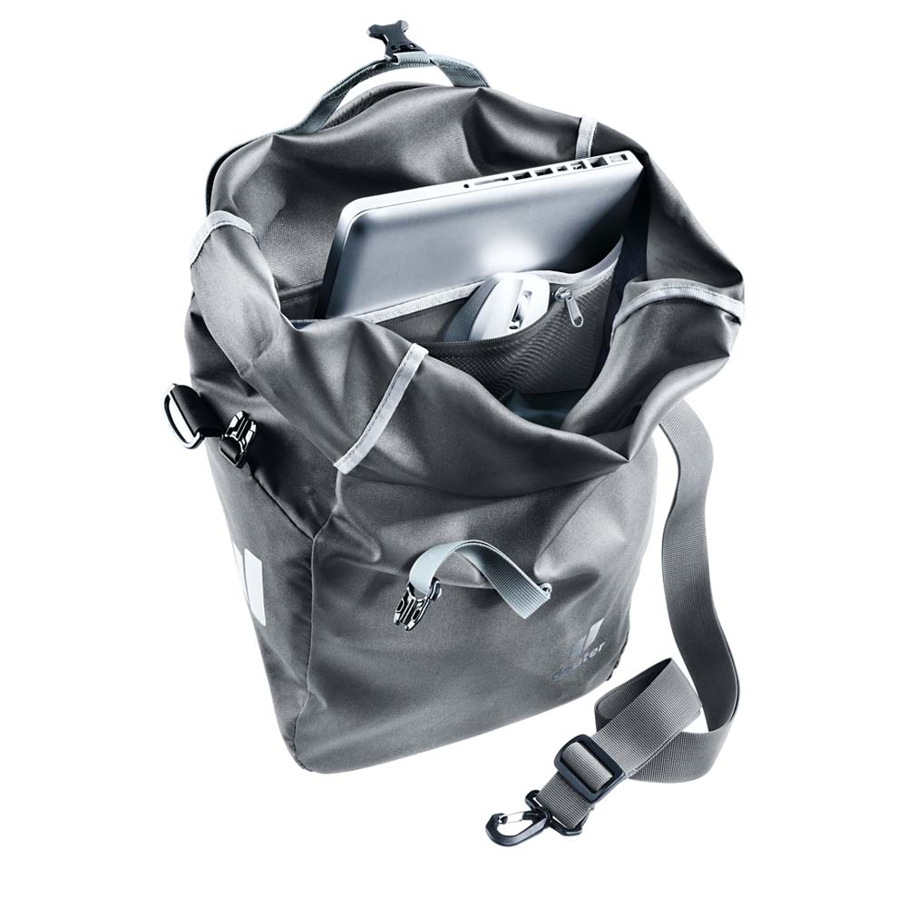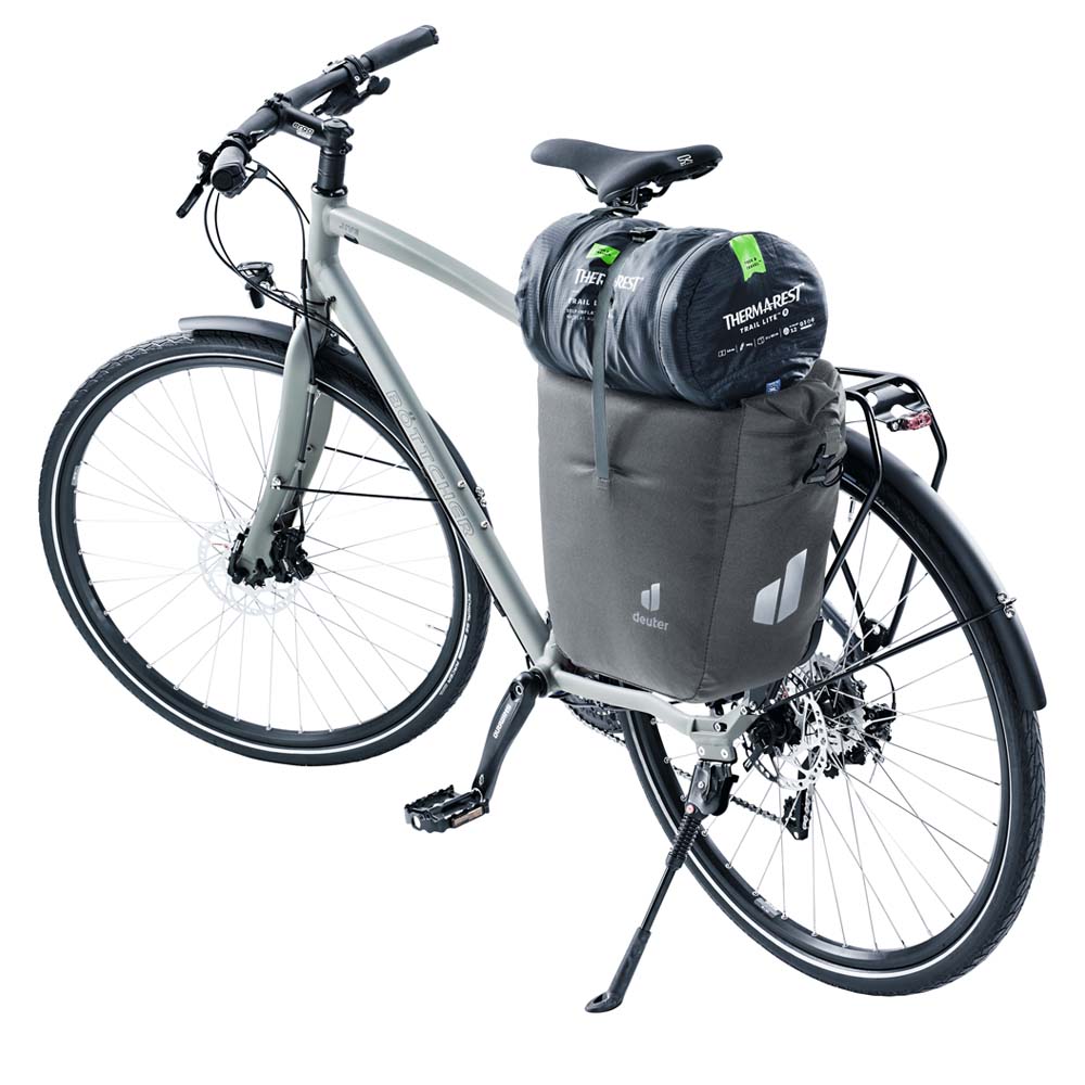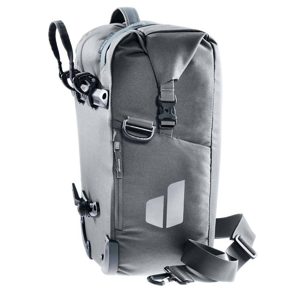 Die praktische Hinterradtasche Valbona 20+5 von Deuter wird für Radausflüge einfach mit einer BagFix-Halterung am Gepäckträger fixiert und bietet dank Roll-Top mit 5 Liter Volumenerweiterung einen schnellen Zugang und genügend Stauraum. Seitentaschen mit Reißverschluss und eine Organisationseinheit im inneren der Tasche bieten zusätzliche Verstaumöglichkeiten für Wechselkleidung und Laptop. Für den Sightseeing-Stopp kann die Tasche entweder über den abnehmbaren Tragegurt bequem geschultert, am Griff getragen oder dank Kantenschutz gut geschützt abgestellt werden.
