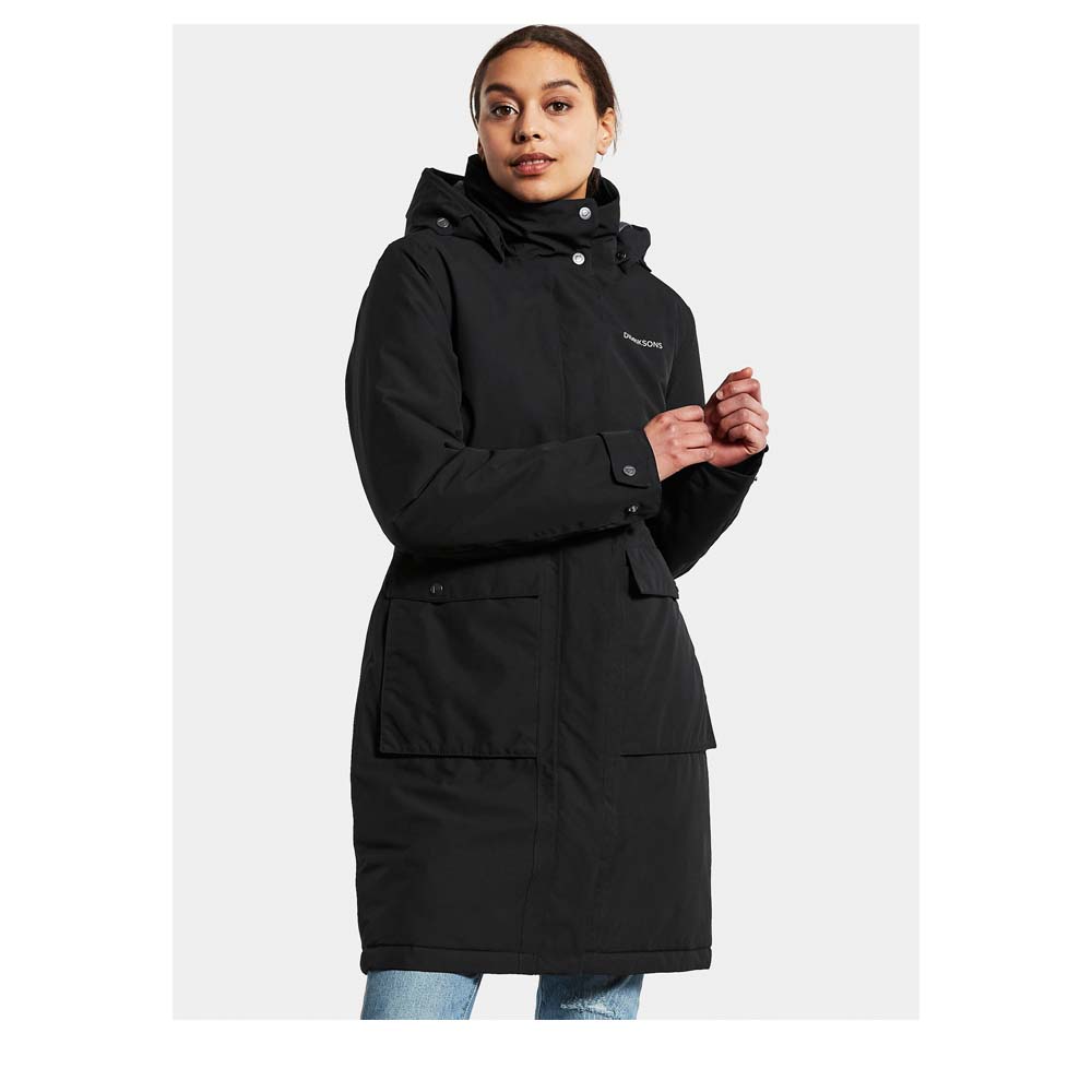Der Emilia Womens Parka 2 Outdoorparka von DIDRIKSONS sorgt mit versiegelten Nähten für eine hundertprozentige Wasser- und Winddichte. Ein Funktionsparka, der dank femininem Schnitt und verstellbarer Taille und verstellbarem Saum nicht aufträgt. Der hohe Kragen und die verstellbare Kapuze mit abnehmbarem Besatz aus Fellimitat, sorgen für zusätzlichen Wetterschutz. Der Zwei-Wege-Reißverschluss verfügt über eine Windschutzleiste.