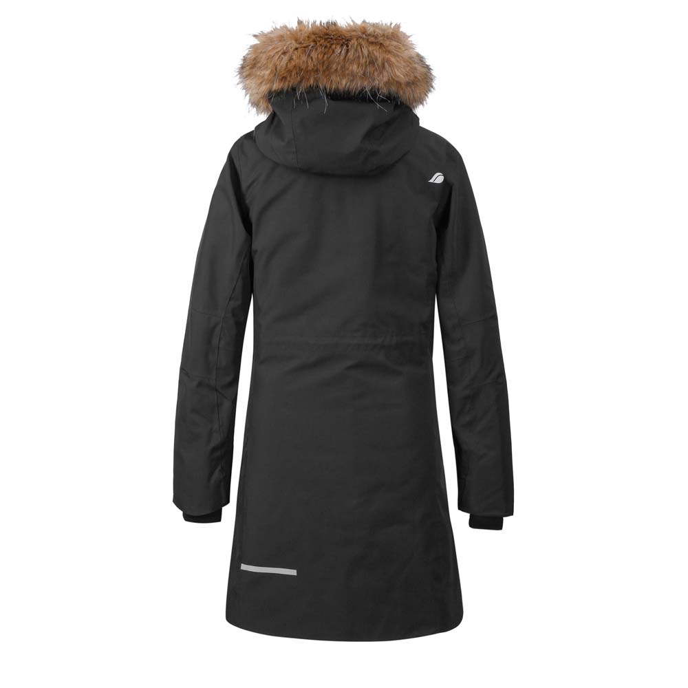 Der hohe Kragen und die verstellbare Kapuze mit dem abnehmbaren Kunstfellbesatz sorgen für flexiblen Wetterschutz, ganz nach dem eigenen Wohlgefühl. Ergänzt wird das Angebot des Erika Parkas durch den 2-Wege-Reißverschluss mit Windschutzleiste, zwei Vordertaschen mit Knopfverschluss, eine Tasche mit wasserdichtem Reißverschluss, zwei Innentaschen, eine davon mit Reißverschluss sowie verstellbaren Saum, Taille und Ärmelabschlüsse und die gerippten Innenbündchen mit Daumenloch. Der Fellimitatbesatz, der Didriksons-Print und das Didriksons-Logo sowie die Reißverschlusslaschen sind reflektierend.