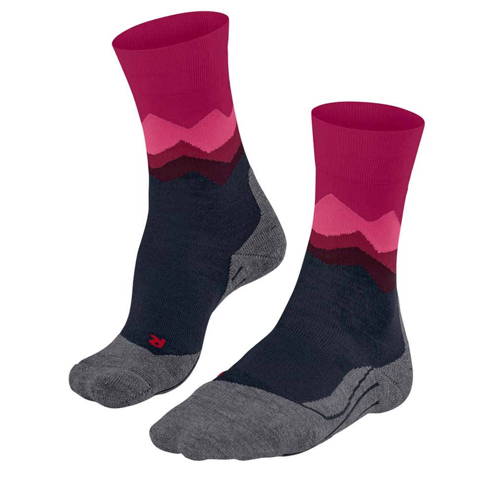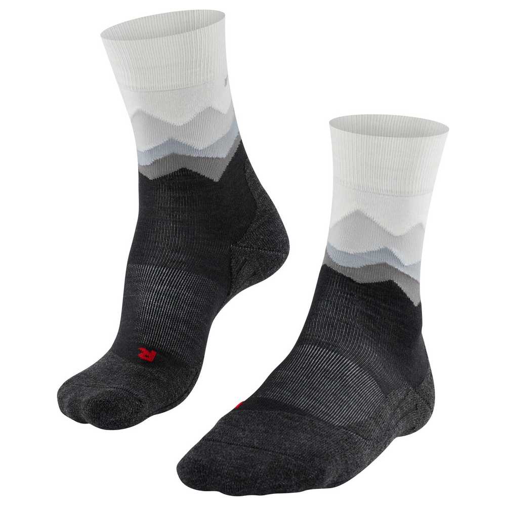 FALKE TK2 Explore Damen Trekking Socken. Die "TK2 Crest" bietet mit ihrer mittelstarken Polsterung und dem Merinowoll-Mix besten Komfort sowie eine gute Wärmeisolation bei Wanderungen in leichtem Gelände und unter allen Wetterbedingungen. Dank schnellem Feuchtigkeitstransport und optimaler Passform wird eine perfekte Temperatur im Schuh und ein hoher Fußkomfort gewährleistet. Die im Schaft integrierte Bergsilhouette in verschiedenen Farbschattierungen macht diese Wandersocke zu einem echten Blickfang.