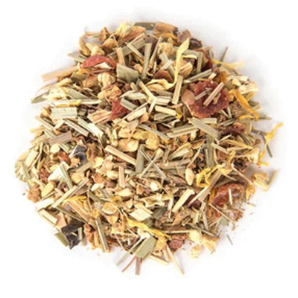 - Zutaten: Ingwer, Apfelstücke, Zitronengras, Hagebuttenrinde, Süßholzwurzel, Zitronenschalen, Zitronensäure, natürliches Aroma, Axamelisblütenblätter Fairtrade, biologisch und Ökozertifiziert (DE-009-Öko-Kontrollstelle)