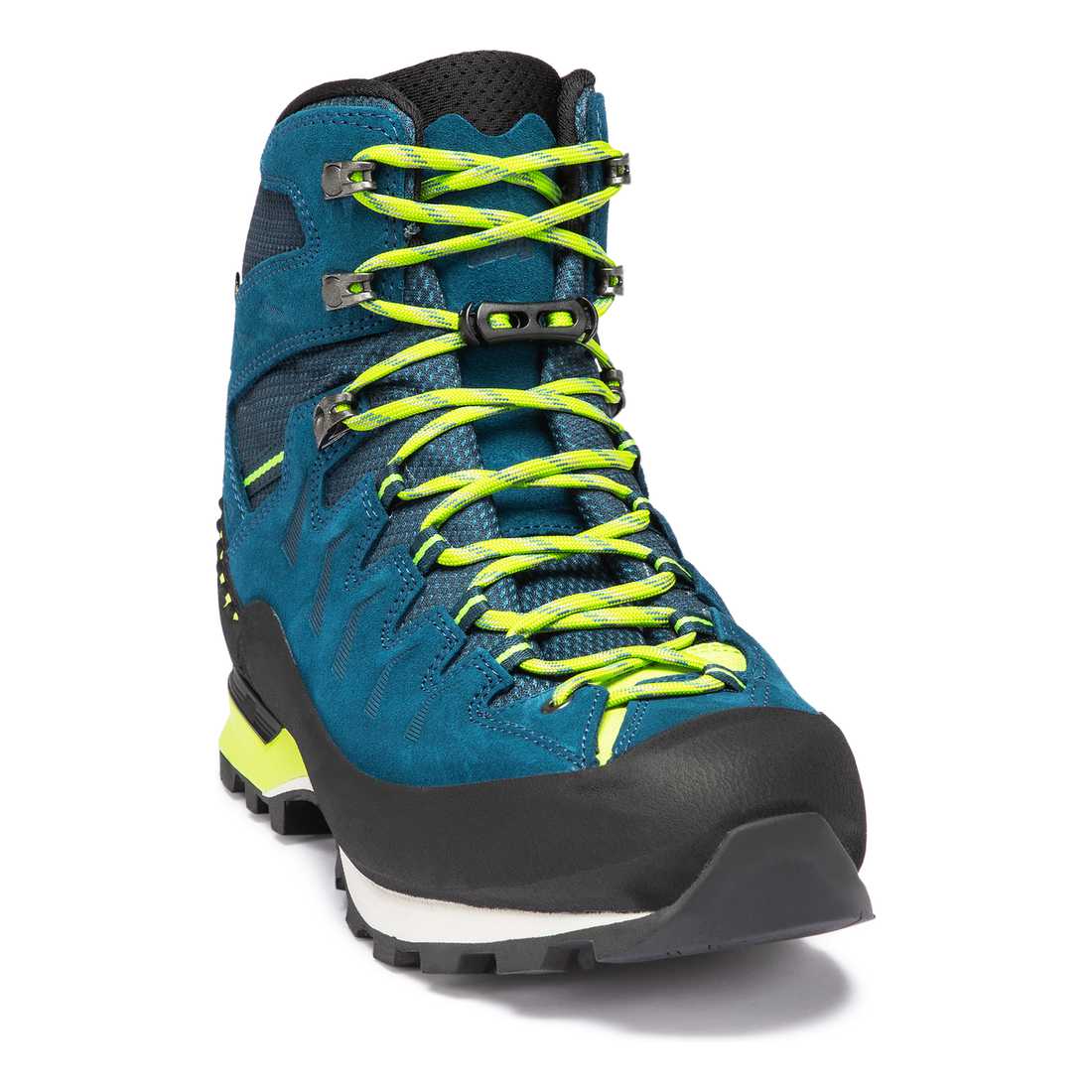 Ein Merkmal der Makra Familie ist die optimierte Ghilly-Schnürung bis in den Zehenbereich – dabei werden die Schnürsenkel durch Textilschlaufen gezogen. Der Fuß hat so auch im vorderen Bereich und in einem halbhohen Modell einen guten Halt und man steht stabil im Schuh. Der Alpine Wide-Leisten bietet einen etwas breiteren Vorfußbereich für mehr Komfort – wodurch der Schuh jedoch nicht an Kletterperformance und Präzision im Antritt verliert.