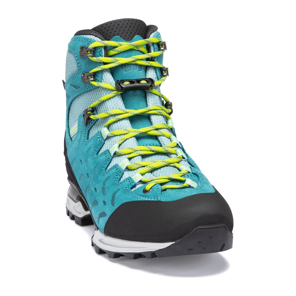 HANWAG Makra Trek GTX Women – ein sportlicher und leichter Trekkingschuh für anspruchsvolle Bergwanderungen. Mit seinem farbenfrohen Design und der Vibram Integral Light Sohlenkonstruktion bietet er eine optimale Kombination aus Dämpfung und Stabilität. Die spezielle Hanwag 3D Prism Base Technologie sorgt für eine besonders leichte und komfortable Sohlenstruktur, während die niedrige Standhöhe die Stabilität erhöht. Der Hanwag 2 Zone Lock ermöglicht eine präzise Fixierung der Schnürung mit einer mechanischen Klemme, die sich nicht unbeabsichtigt löst. Das robuste Perwanger Leder ist langlebig und atmungsaktiv, während die wasserdichte GORE-TEX Membran für trockene Füße bei jedem Wetter sorgt. Dieser Schuh ist ideal für Trekkingtouren bis in Höhen von 3000 Metern und überzeugt durch seine Wiederbesohlbarkeit, wodurch er nachhaltig nutzbar bleibt.