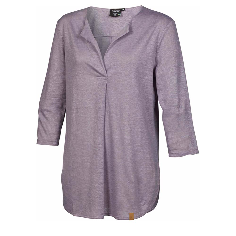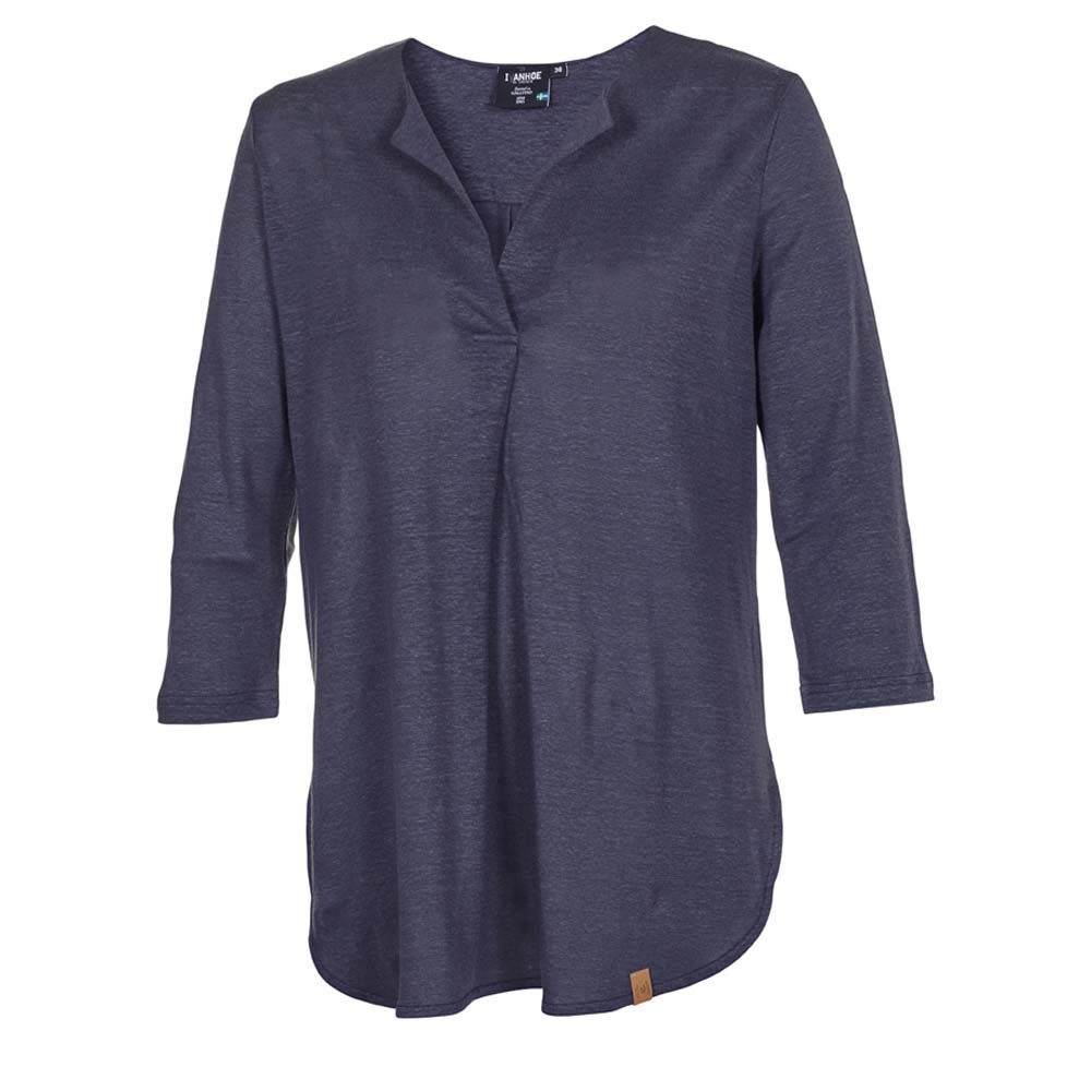 Das Gy Ilse von Ivanhoe ist ein Leinen Shirt mit  3/4 Ärmeln und großzügiger Passform. Stilvolles Design in der Halsöffnung und perfekte Tiefe im Ausschnitt. Angenehm kühlend, luftdurchlässig und leicht präsentiert sich die Qualität des natürlichen Leinenmaterials, was sich an heißen Sommertagen sehr bewährt. Auf der unteren linken Seite befindet sich die Logo-Markierung im Jacron. Jacron ist ein Material, das wie Leder aussieht, aber eigentlich ein einzigartiges Papiermaterial ist.