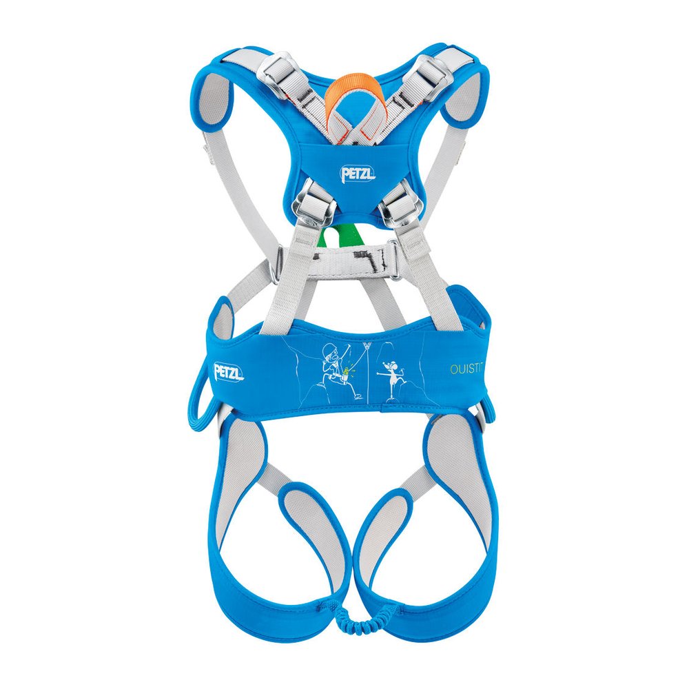 Mit dem Petzl Ouistiti können kleine Nachwuchstalente ihre ersten Erfahrungen an der Kletterwand sicher und komfortabel sammeln. Dieser Kinder-Komplettgurt zeichnet sich durch eine besonders einfache Handhabung aus: Durch kurzes Schütteln an der orangefarbenen Rückenöse bringt sich der Gurt fast von selbst in die richtige Form. Die halbstarre Konstruktion sowie die farbliche Trennung (grauer Schaumstoff innen, blaues Gewebe außen) unterstützen Eltern und Kinder beim intuitiven Anlegen. Für einen hohen Wohlfühlfaktor sorgt die durchgehende Polsterung aus geschlossenzelligem Schaumstoff an Hüftgurt, Beinschlaufen und Schulterträgern, die sowohl am Boden als auch beim freien Hängen bequem sitzt. Sicherheit wird hier großgeschrieben: Das Einstellsystem mit den bewährten DOUBLEBACK-Schnallen befindet sich auf der Rückseite und ist somit für das Kind schwer erreichbar. Ein vorderseitiger, verstärkter Einbindepunkt in grüner Farbe erleichtert das korrekte Anseilen und sorgt für eine stabile Position beim Abseilen. Da zum Schließen kein zusätzlicher Karabiner benötigt wird, schränkt der Gurt die Bewegungsfreiheit beim Spielen zwischen den Kletterpassagen nicht ein. Dank der dorsalen Befestigungsöse ist er zudem vielseitig für andere Aktivitäten in Hochseilgärten oder Vereinen einsetzbar.