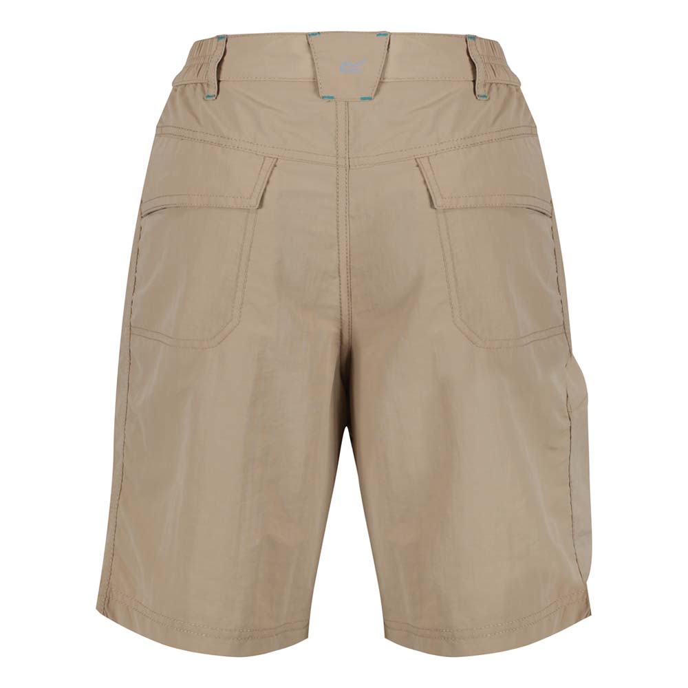 Die Regatta Chaska Short Women ist eine Damen Short. Die Beinlänge reicht etwas bis oberhalb der Knie. Die federleichte Hose ist wasserabweisend und hat einen UV-Schutz von (LSF) 40. Der Taillenbund ist auf der Rückseite elastisch. Die Beinsaumen haben einen Kordelzug.