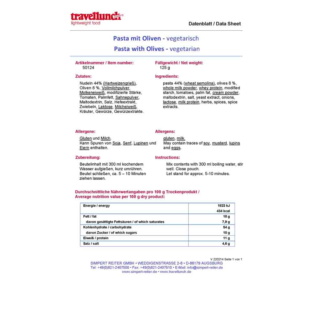 Produktinformationen "TRAVELLUNCH Mahlzeit Pasta mit Oliven, vegetarisch, 250 g – Trekkingnahrung"