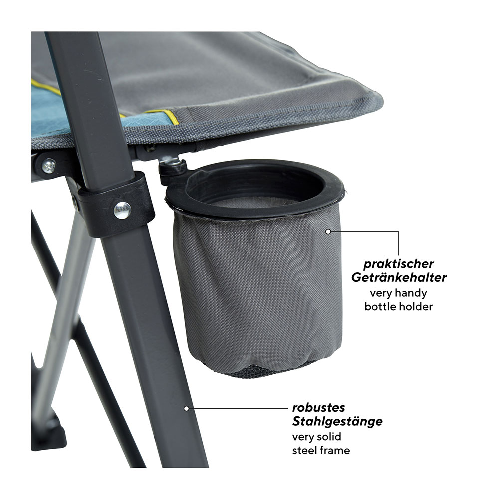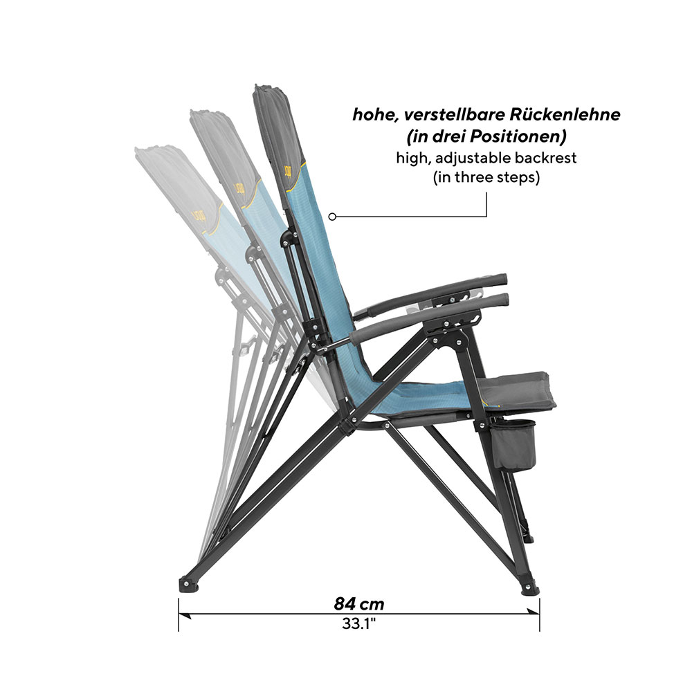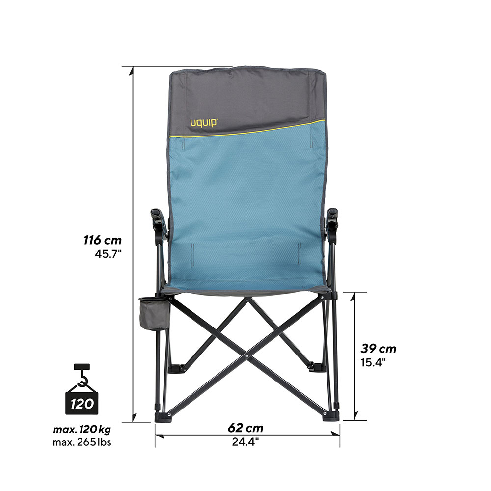 Der UQUIP Becky Faltstuhl hat eine besonders hohe und in drei Positionen verstellbare Rückenlehne und bietet so besonderen Sitzkomfort, der durch einen gepolsterten Kopfbereich noch erhöht wird. Ein Getränkehalter ist auch integriert.