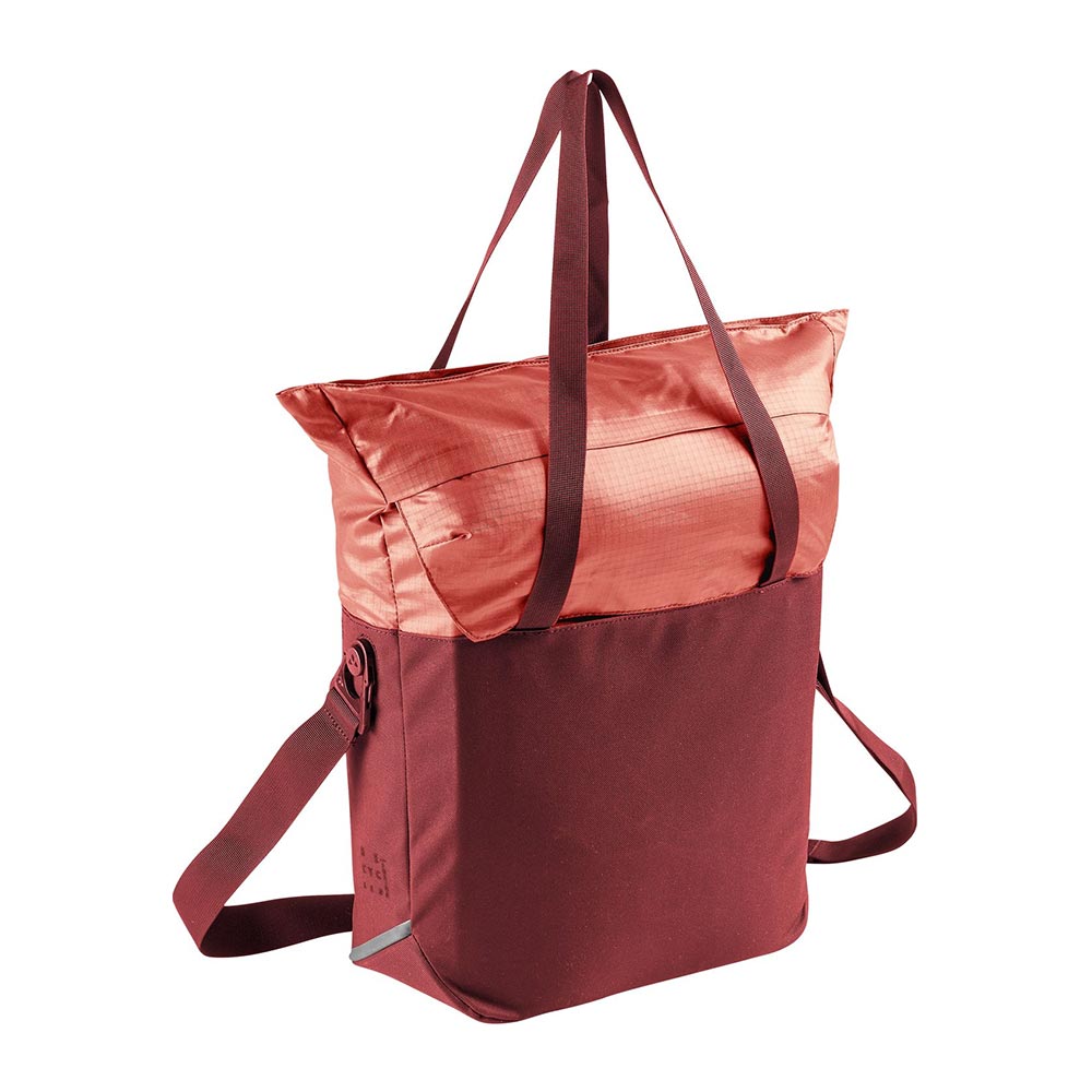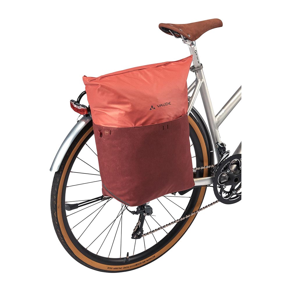 Ob für den Wochenendeinkauf oder als stilvoller Begleiter für den Alltag, der Vaude CityShop Bike ist eine schicke, elegante Einkaufstasche, die am Gepäckträger befestigt werden kann. Mit ihrem 24 l Volumen kann sie trotzdem alle Ihre Markteinkäufe aufnehmen. Am Ziel angekommen, wird die dezente Schiene mit abschließbaren QMR-Haken (z.B. Abus-Schloss 145/20, nicht im Lieferumfang enthalten) über zwei Druckknöpfe unsichtbar mit einer Klappe verschlossen. Die Tasche kann klassisch mit zwei langen, verstaubaren Henkeln oder mit einem längenverstellbaren, abnehmbaren Gurt über die Schulter oder crossbody getragen werden. Oben lässt sich die Einkaufstasche mit einem Reißverschluss sicher verschließen. Im Inneren befinden sich ein nicht gepolstertes Fach in Tablet-Größe und ein Netzfach mit Reißverschluss für kleine Gegenstände wie Geldbörse, Telefon und Stifte. Dank des stabilisierten Bodens kann die Tasche aufrecht stehen. Reflektierende Elemente fügen sich in das schicke Design ein und finden sich auch auf der integrierten Regenhülle wieder. Unauffällige Schlaufen ermöglichen die Anbringung eines OSRAM Light Me Up Kits. Das gewachste Primärmaterial besteht zu 50 % aus recyceltem Polyester, das sekundäre Kontrastmaterial ist zu 100 % recycelt. Das CityShop Bike ist mit dem PFC-freien, wasserabweisenden Eco Finish ausgestattet. Das VAUDE Green Shape Label steht für umweltfreundliche, funktionale Produkte aus nachhaltigen Materialien.
