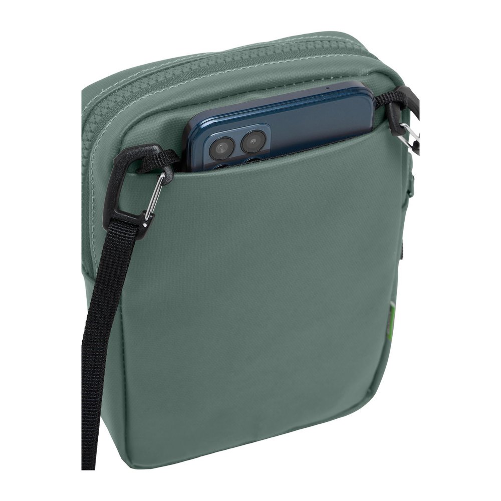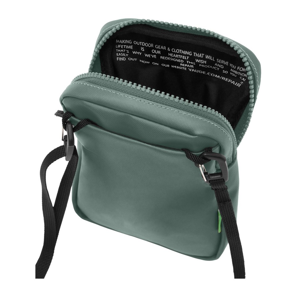 VAUDE Kataja - Tasche – Die VAUDE Kataja ist eine kleine Sicherheitstasche, die sich ideal für Reisen und den Alltag eignet. Sie bietet übersichtliche Fächer zur Aufbewahrung von Smartphone, Geldbeutel und Schlüsseln. Die Tasche kann sogar unter der Jacke getragen werden und ist dank des abnehmbaren Schultergurts vielseitig einsetzbar. Neben dem Hauptfach mit Reißverschluss gibt es eine zusätzliche Außentasche und eine Netzinnentasche. Die Tasche ist aus PVC-freiem Planenmaterial gefertigt und wurde mit Eco Finish wasserabweisend behandelt – ohne Fluorcarbone (PFC). Das Material besteht aus recyceltem PET, was sie zu einer umweltfreundlichen Wahl macht.