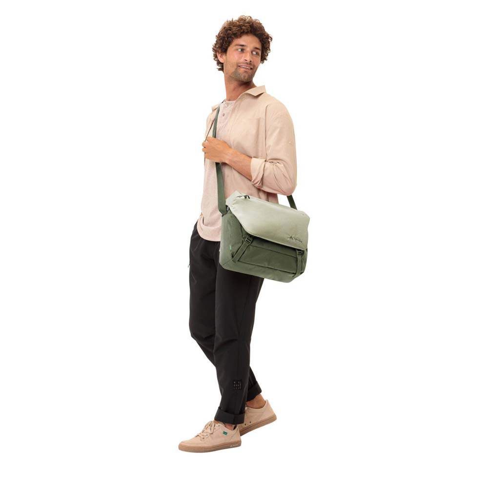 Die VAUDE Rom M III ist eine vielseitige und umweltfreundliche Umhängetasche, die speziell für den urbanen Alltag konzipiert wurde. Gefertigt aus robustem, recyceltem Polyester und versehen mit der wasserabweisenden, PFC-freien Eco Finish Imprägnierung, bietet sie zuverlässigen Schutz für den Inhalt. Ein wesentliches Merkmal ist der gepolsterte Taschenboden, der die Ausrüstung beim Abstellen zusätzlich dämpft und für Stabilität sorgt. Das 12 Liter fassende Hauptfach ist übersichtlich strukturiert und verfügt über eine durchdachte Organizer-Aufteilung mit einem gepolsterten Fach für ein Tablet sowie Schlüsselhalter und Einsteckfächern für Smartphone und Schreibutensilien. Zusätzlichen Stauraum bieten die Reißverschlusstasche im Deckel sowie eine separate Fronttasche für schnellen Zugriff auf wichtige Kleinteile. Der längenverstellbare Schultergurt ist mit einem komfortablen Polster ausgestattet, was zusammen mit dem körpernahen Sitz für ein angenehmes Tragegefühl sorgt. Als klimaneutrales Green Shape Produkt vereint die Rom M III funktionale Alltagstauglichkeit mit einer nachhaltigen und ressourcenschonenden Fertigung.